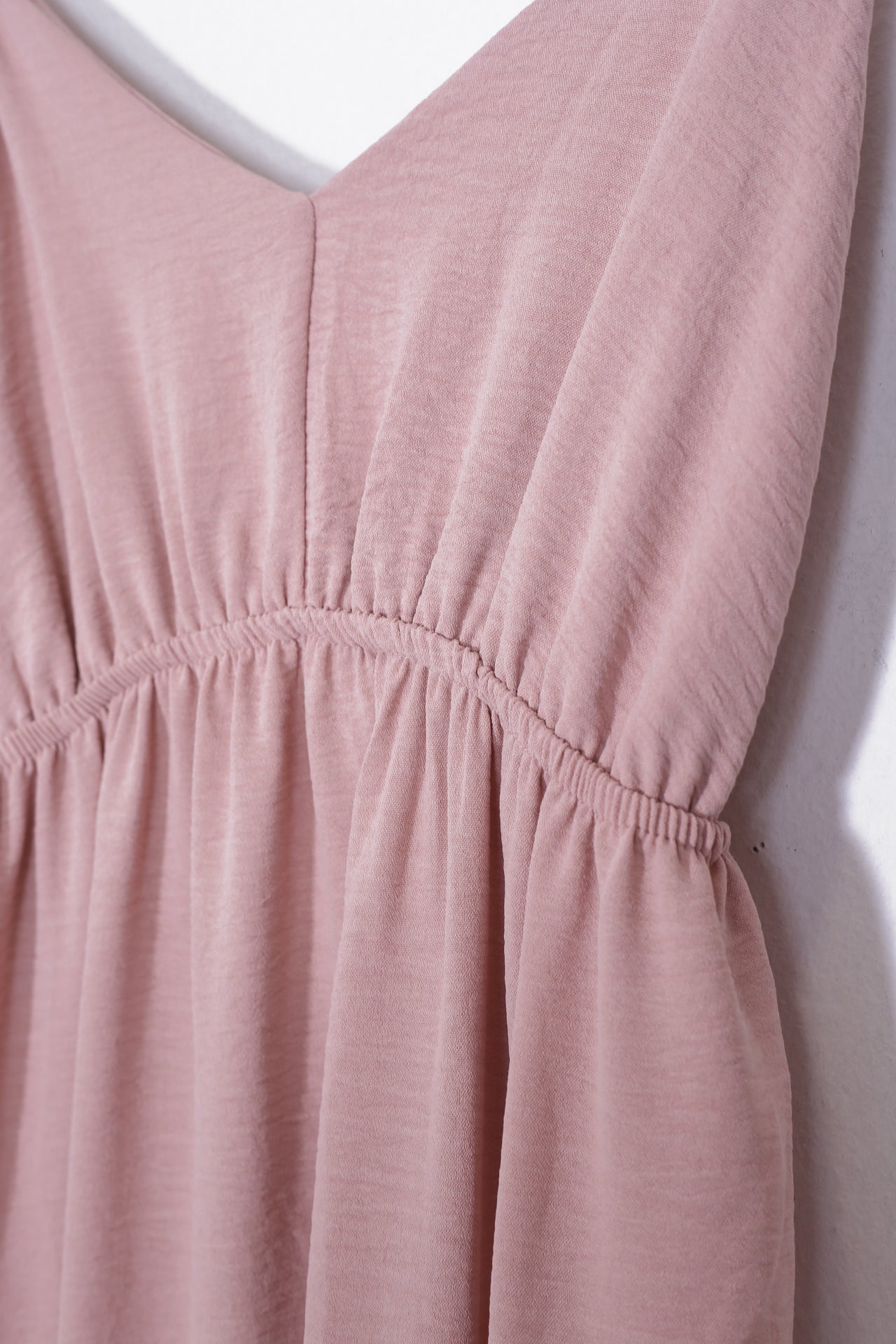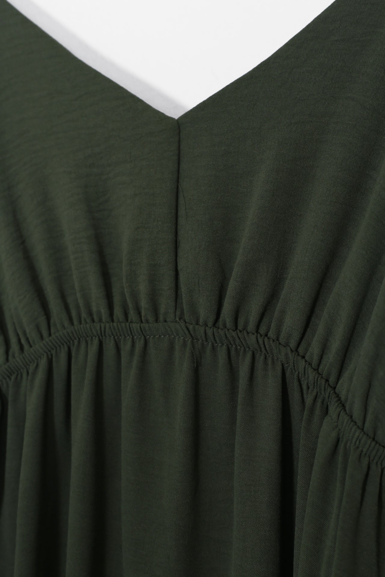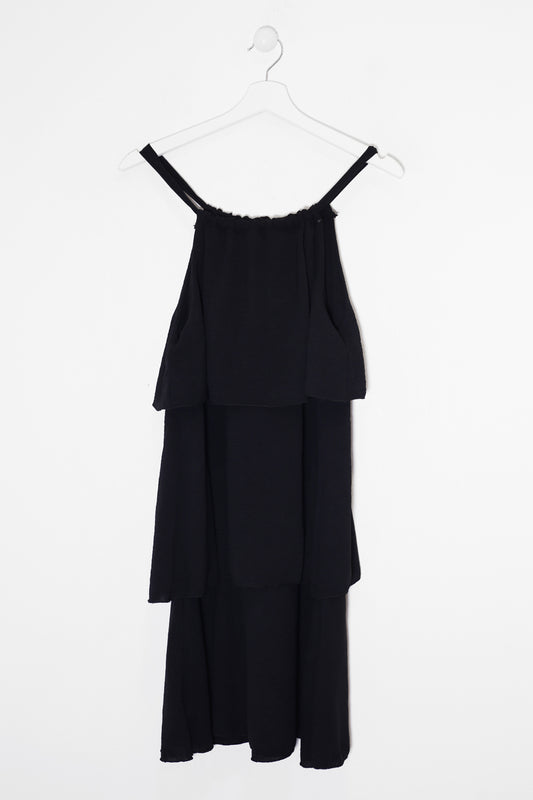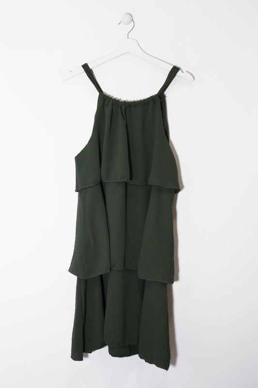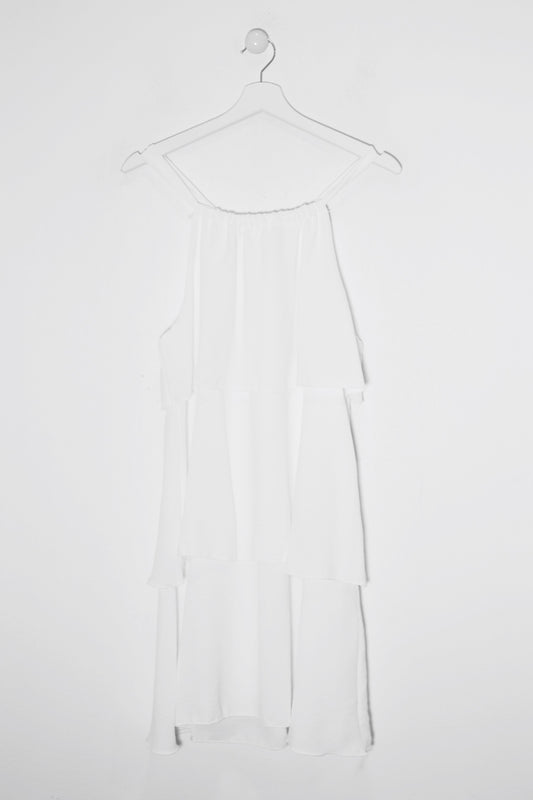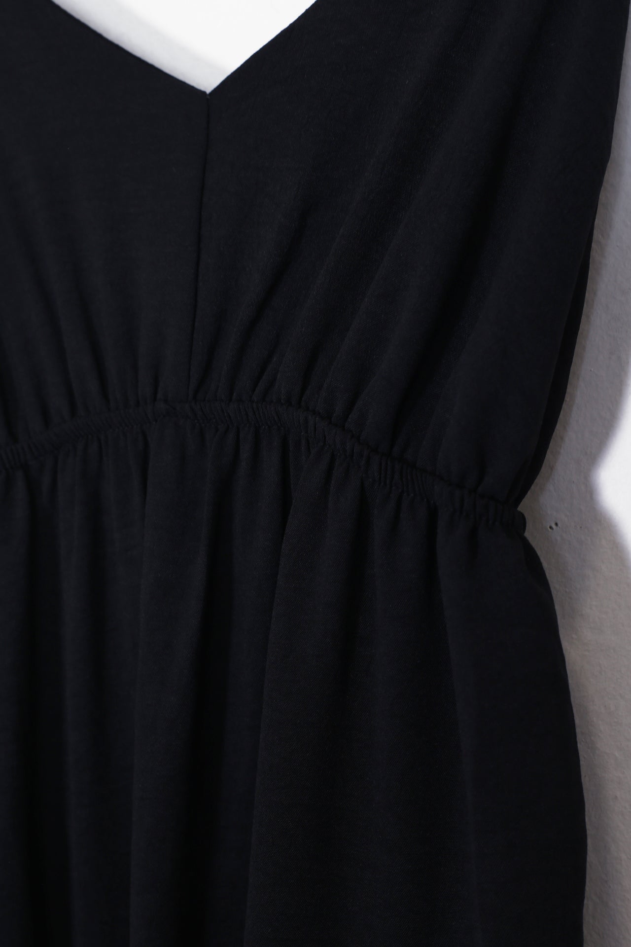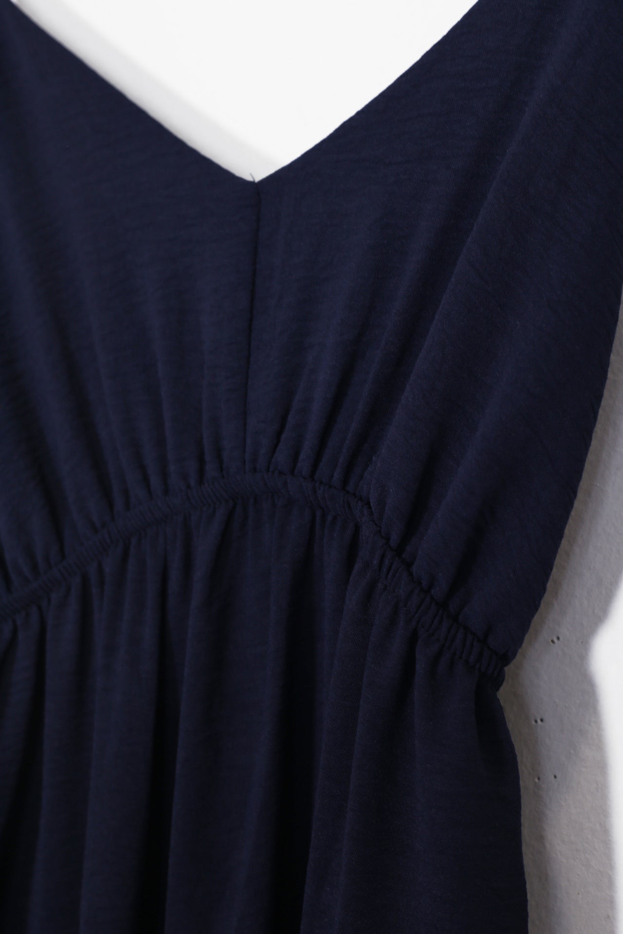 Vestido largo con escote en punta y tirantes finos ajustables. Elástico bajo el pecho. Detalle de volantes en falda.