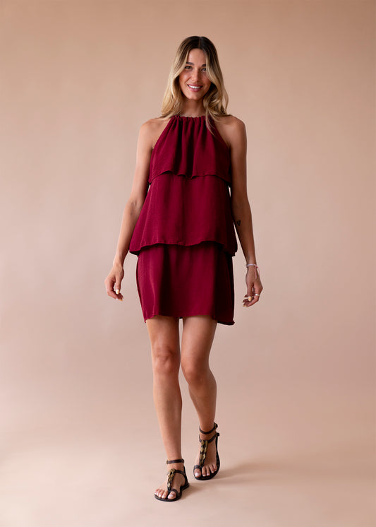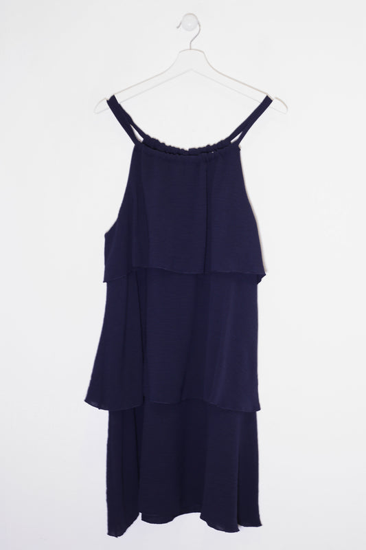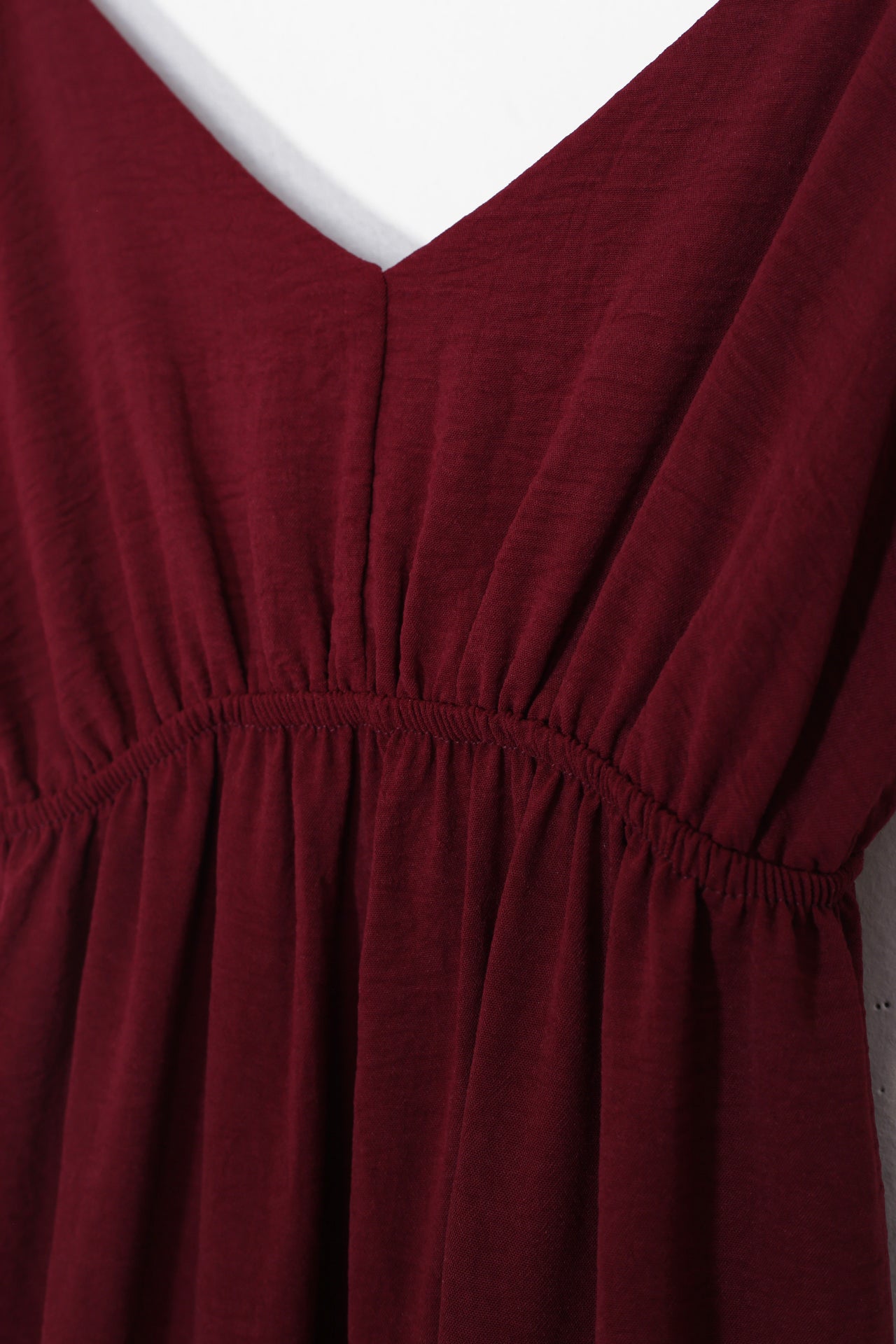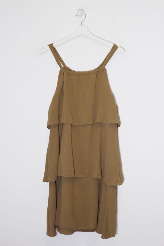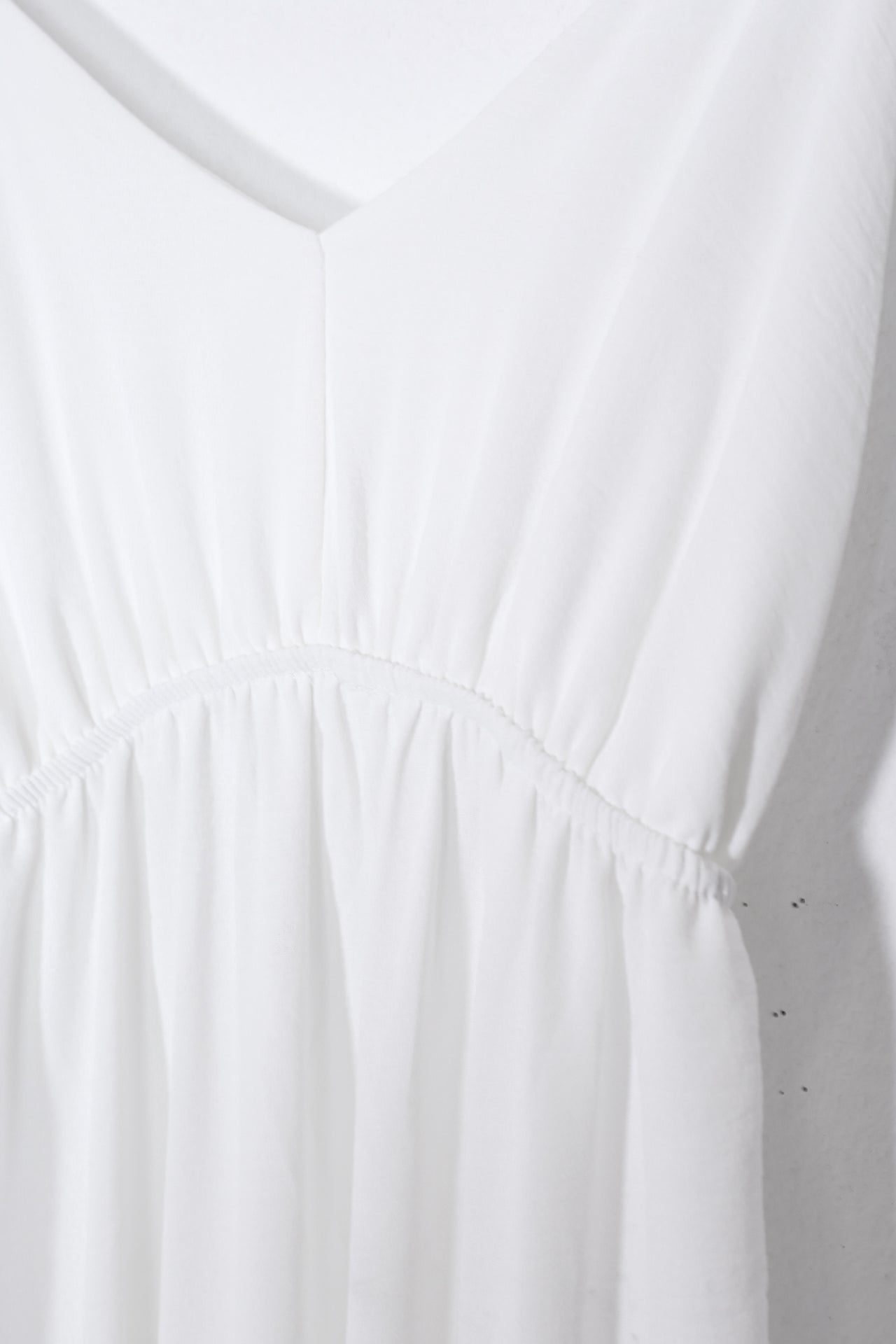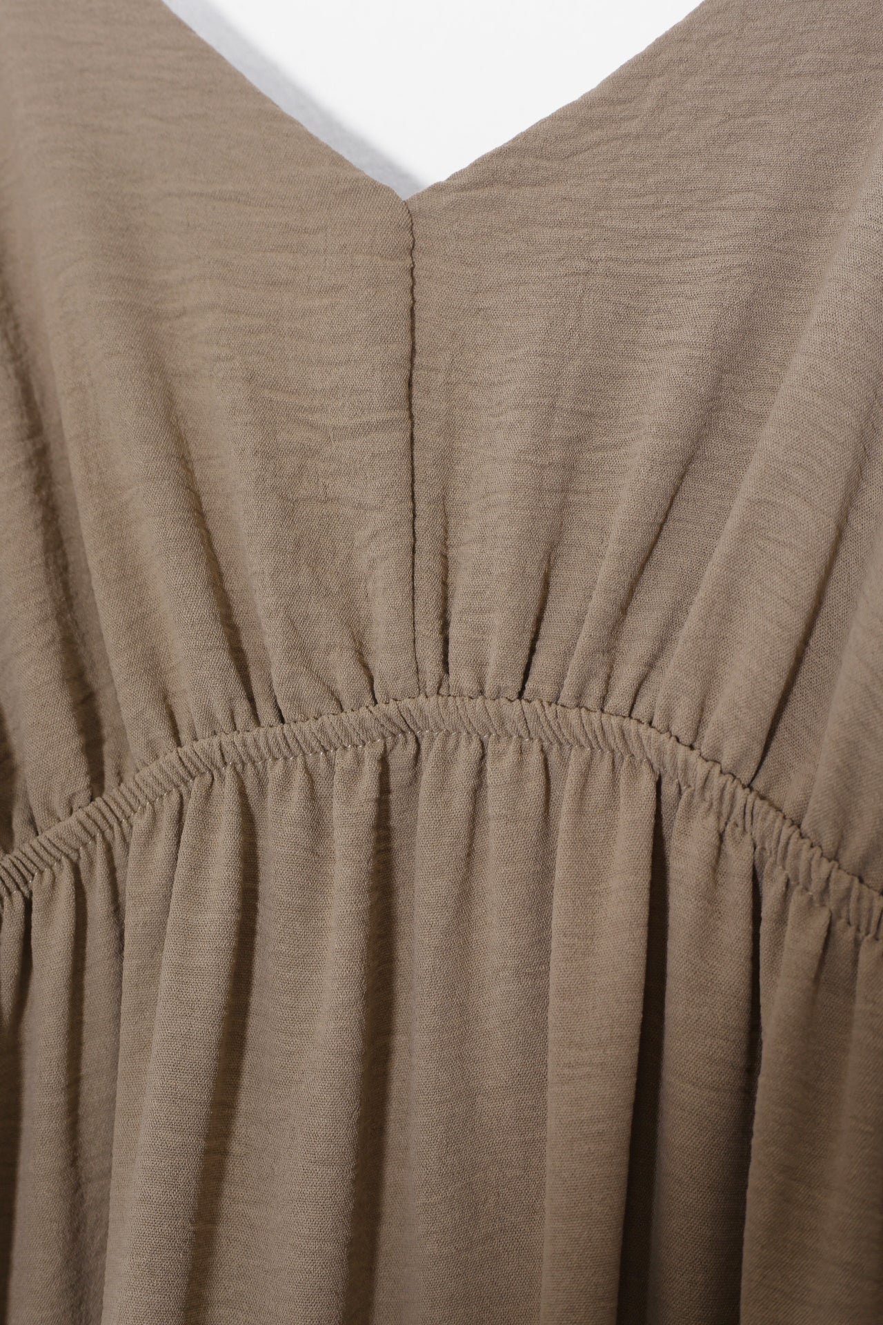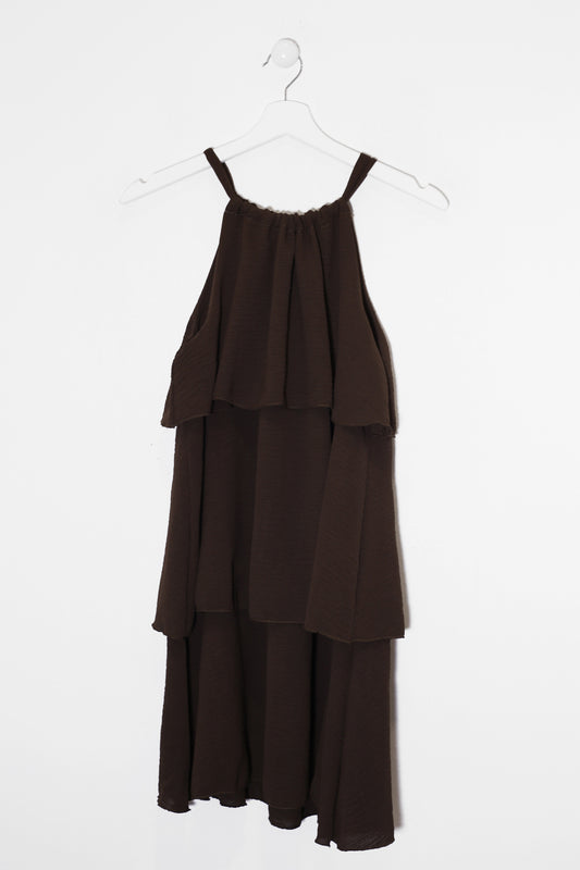 Vestido largo con escote en punta y tirantes finos ajustables. Elástico bajo el pecho. Detalle de volantes en falda.