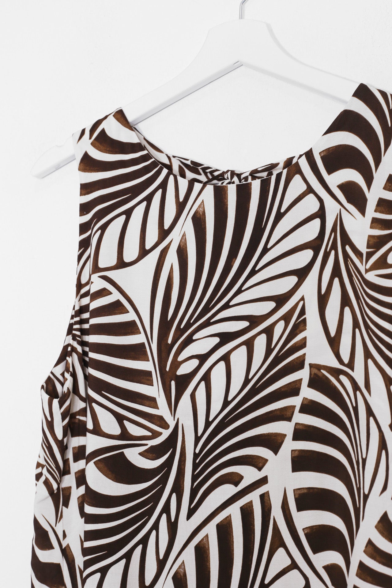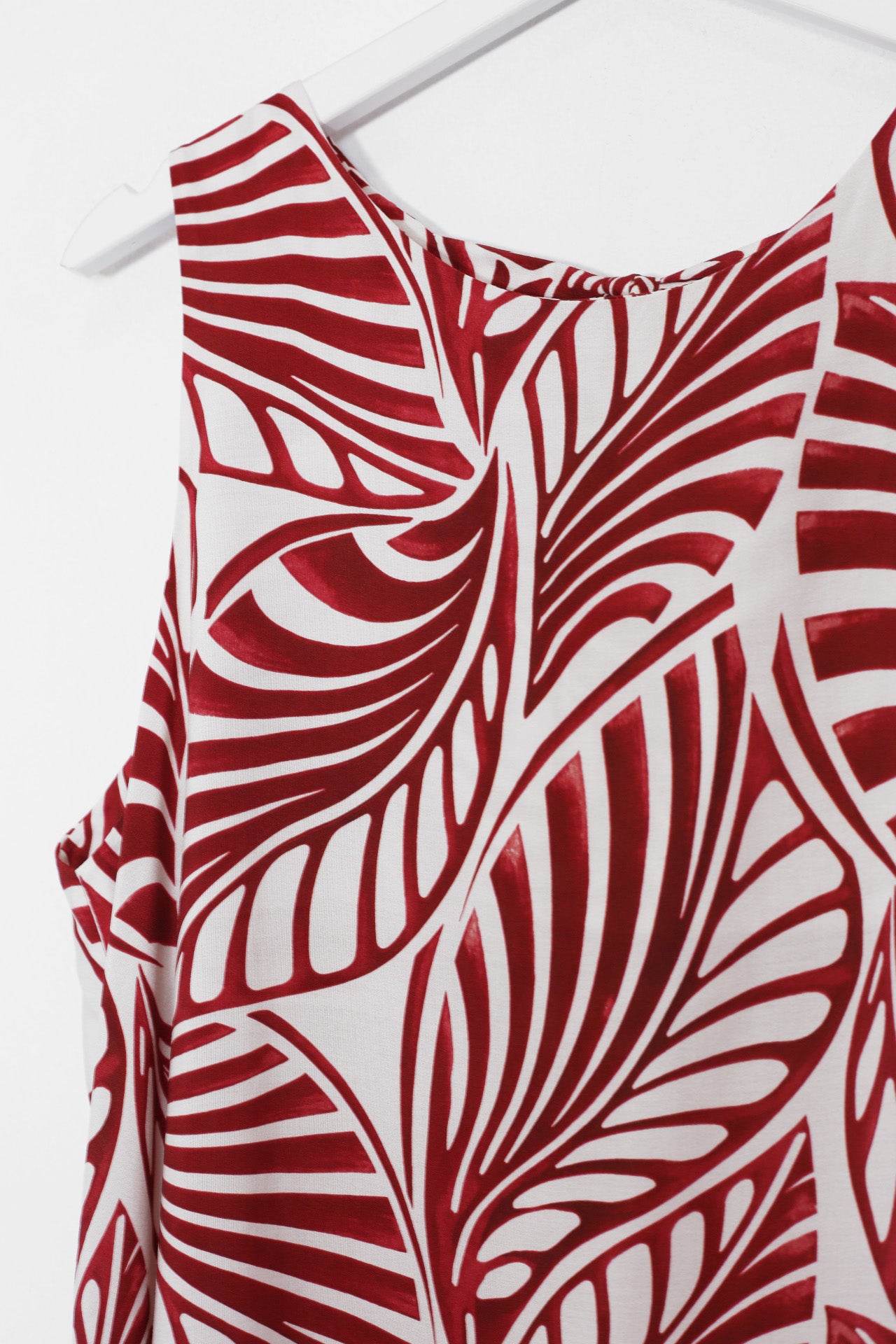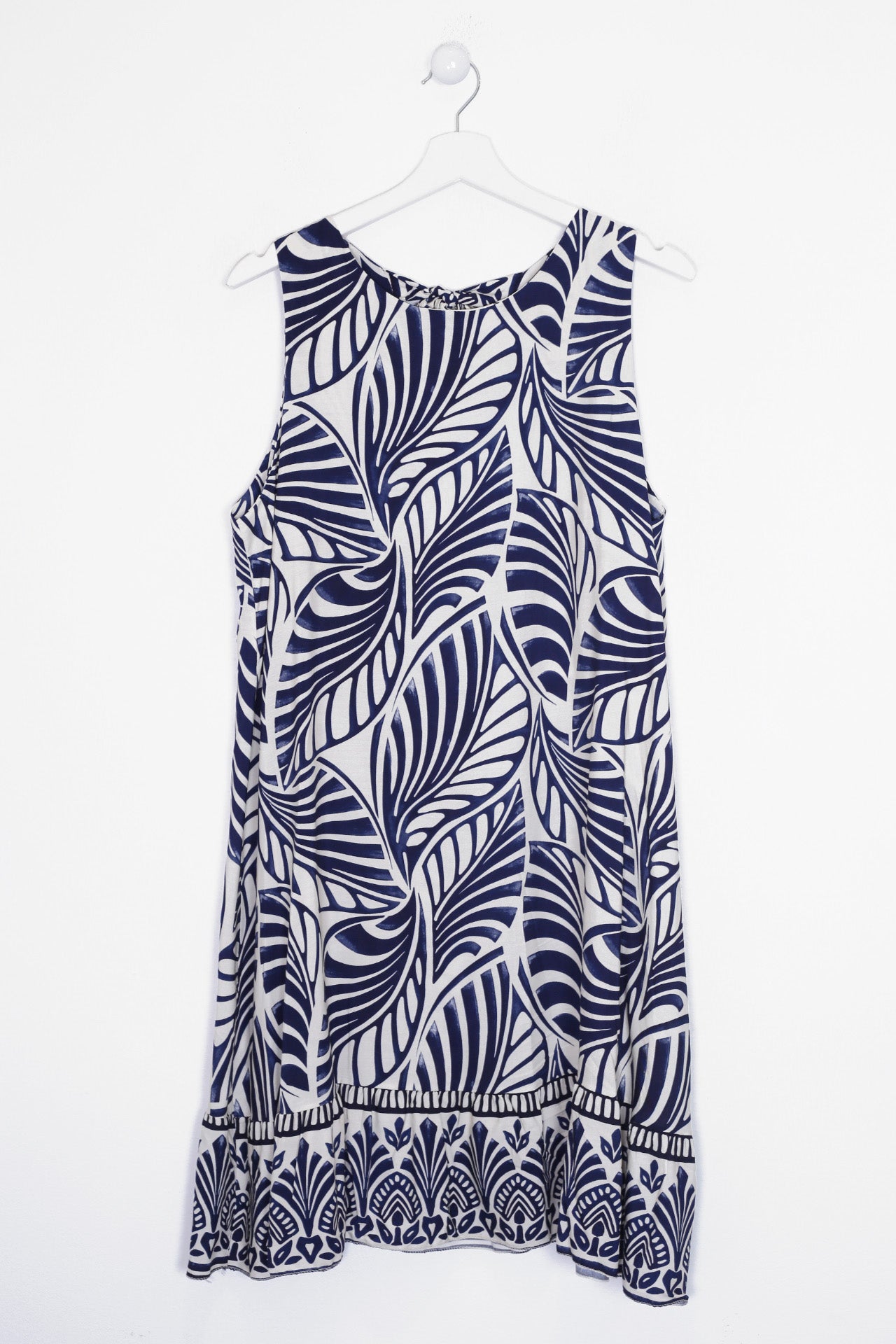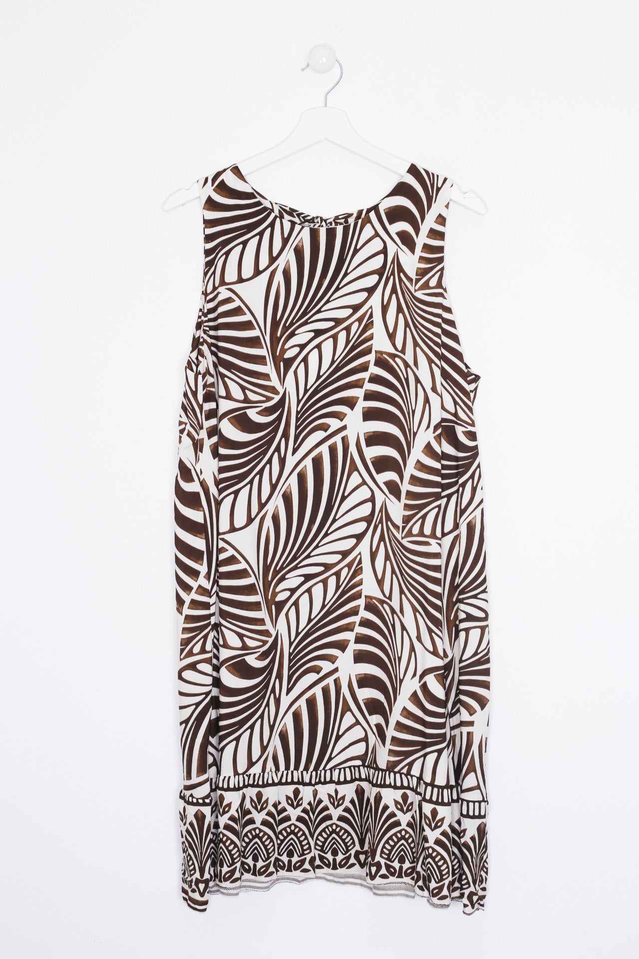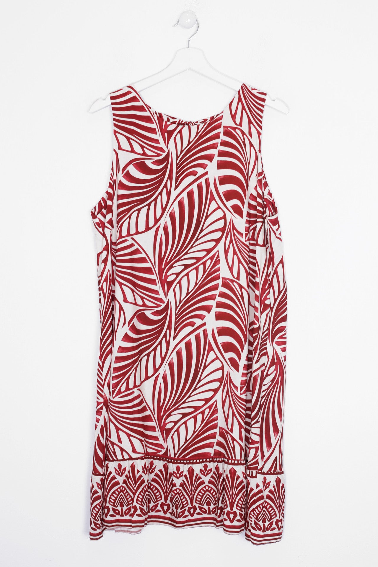 Vestido sin mangas con cuello redondo. Abertura en espalda con lazo. Detalle de volante en el bajo. Corte evasé. Estampado con hojas.