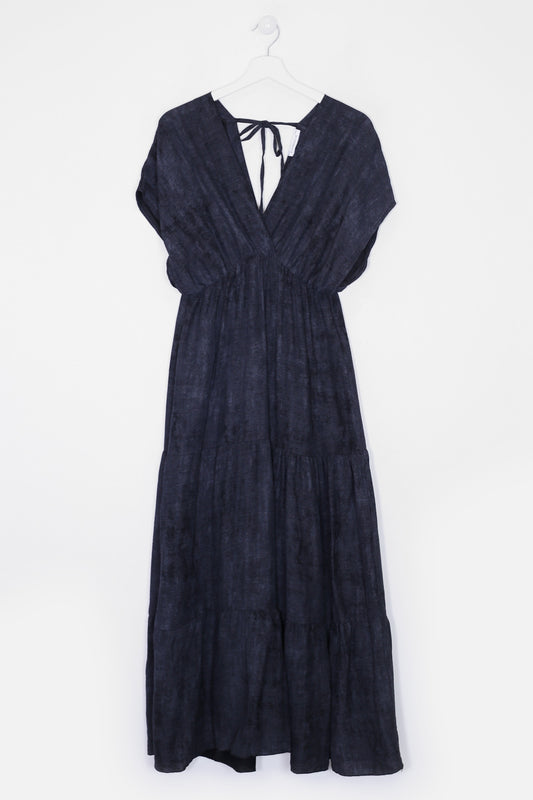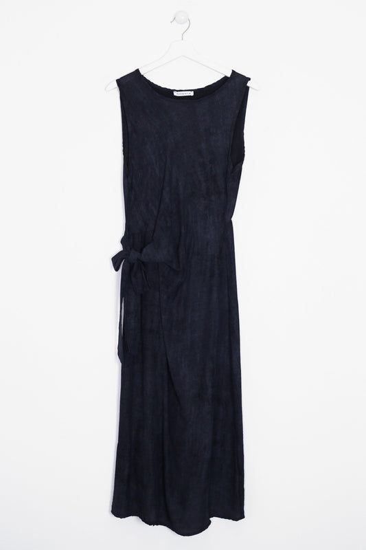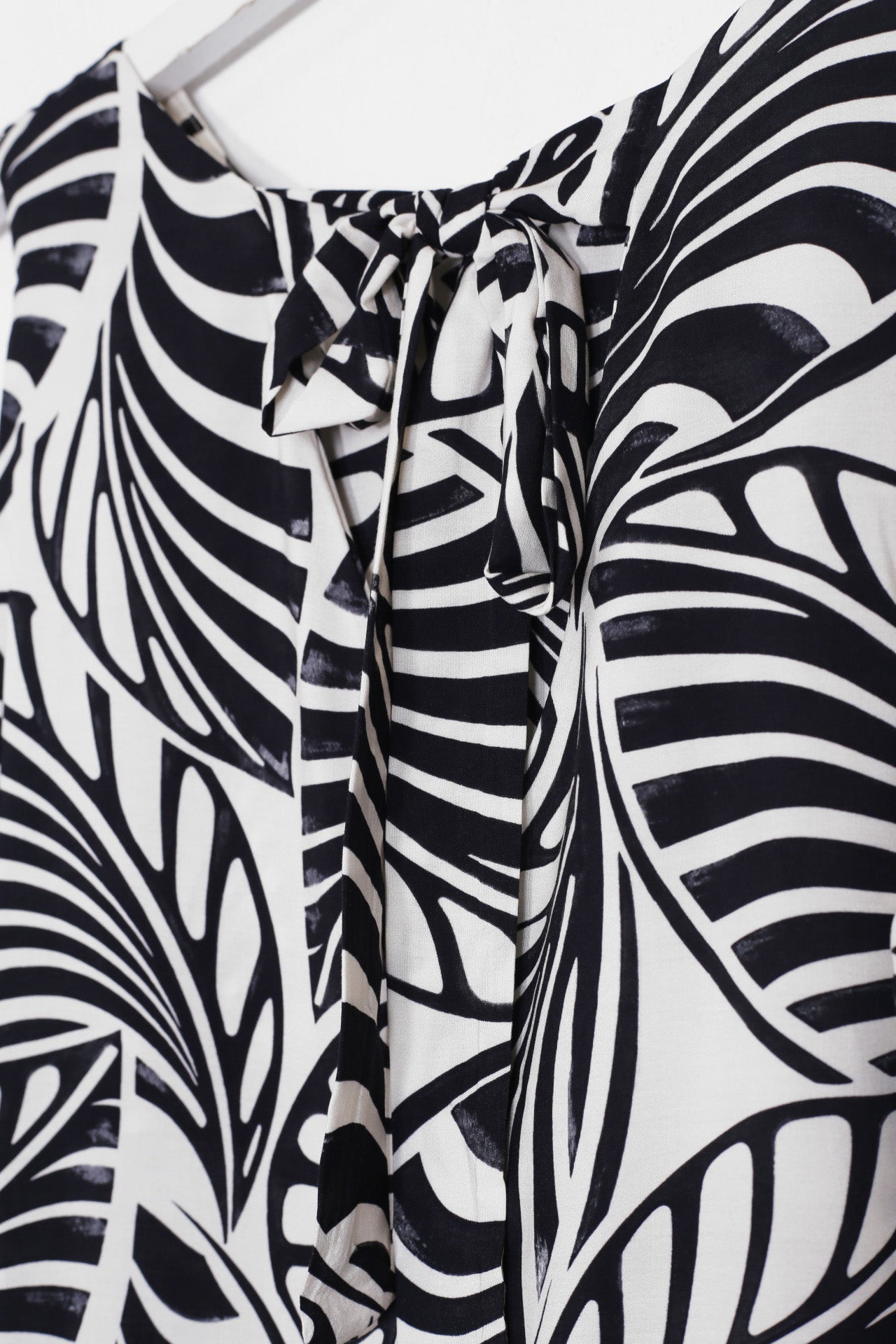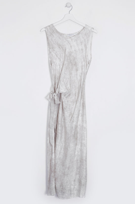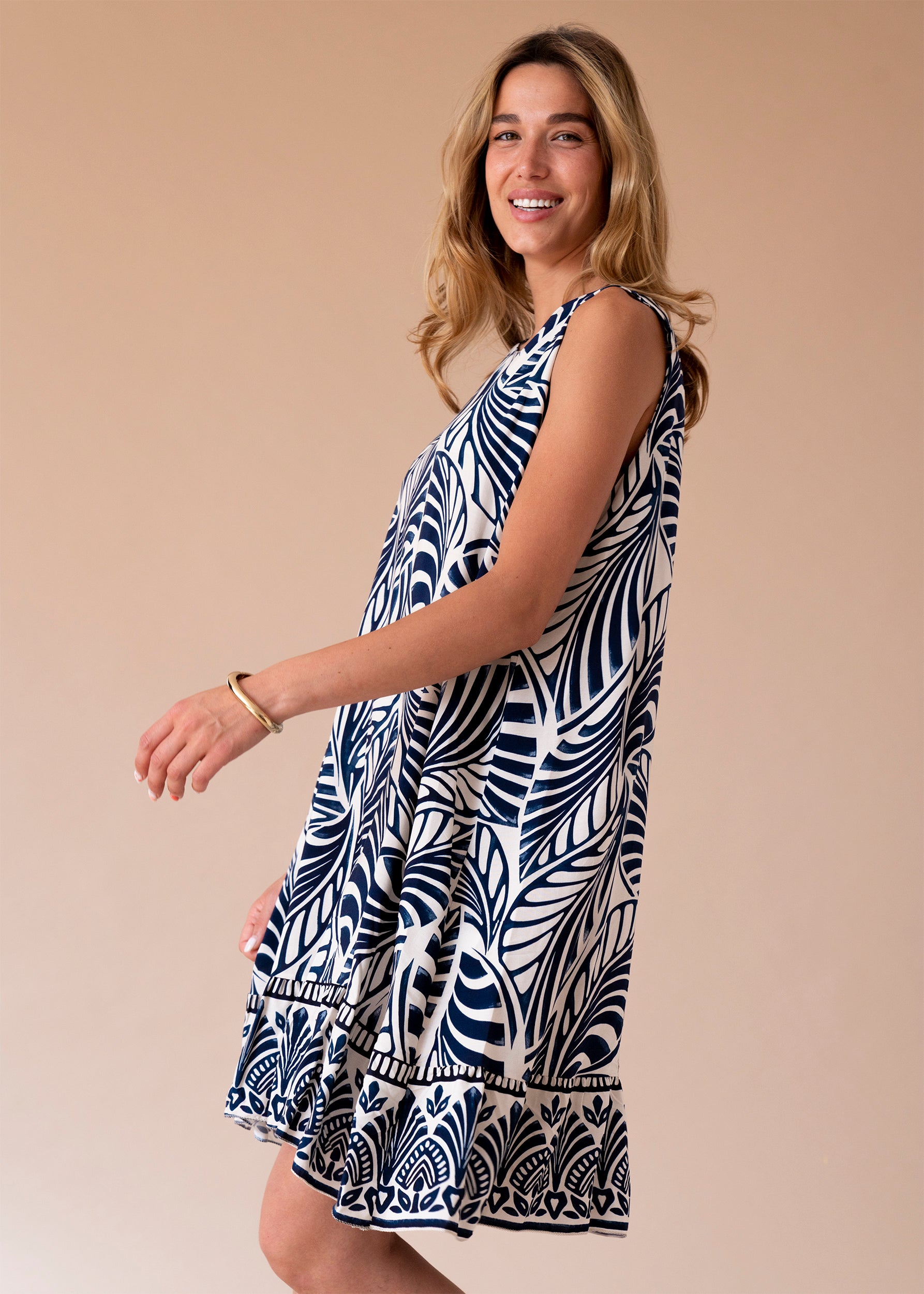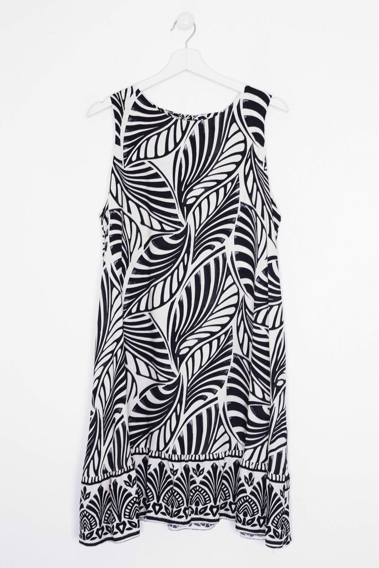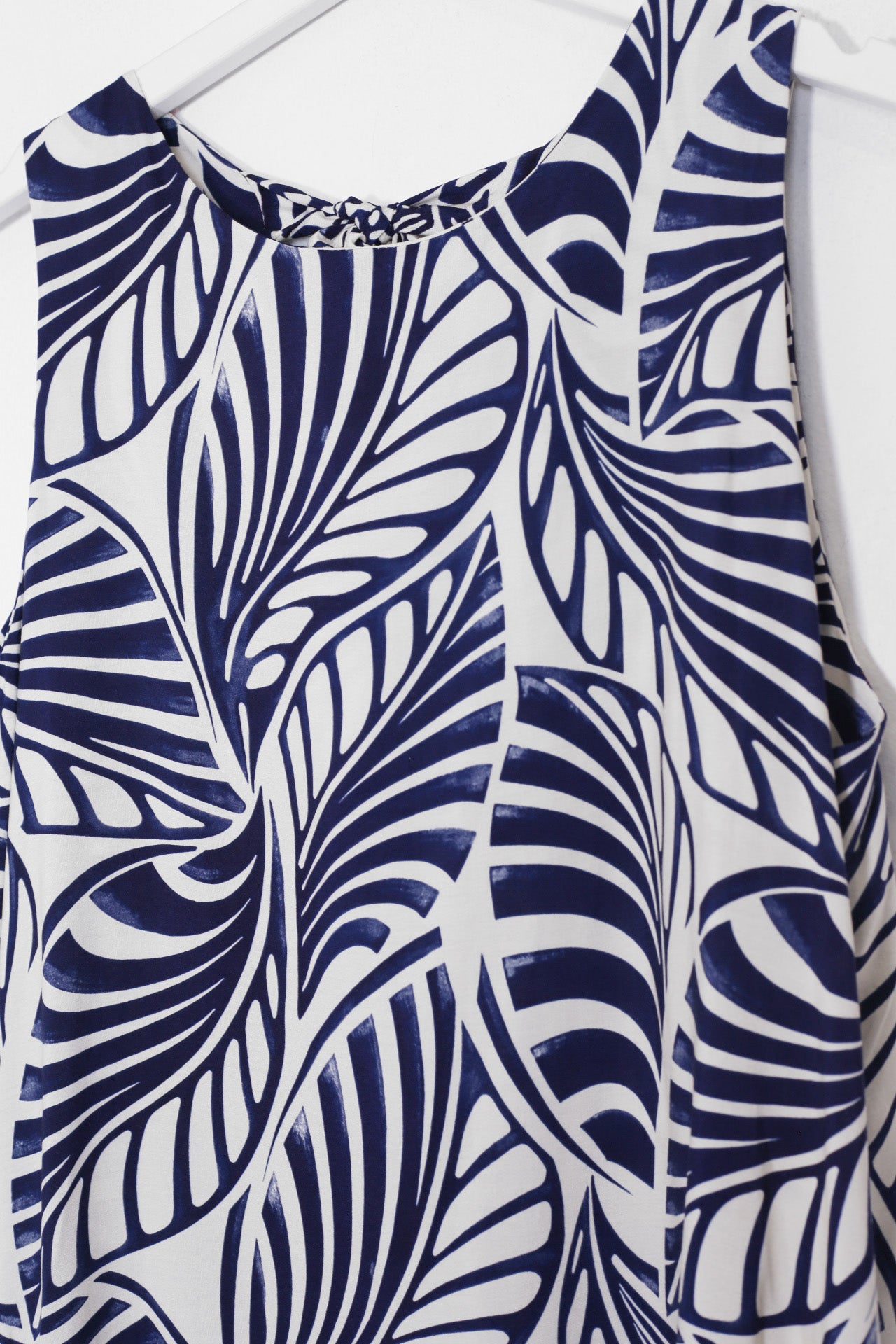 Vestido sin mangas con cuello redondo. Abertura en espalda con lazo. Detalle de volante en el bajo. Corte evasé. Estampado con hojas.