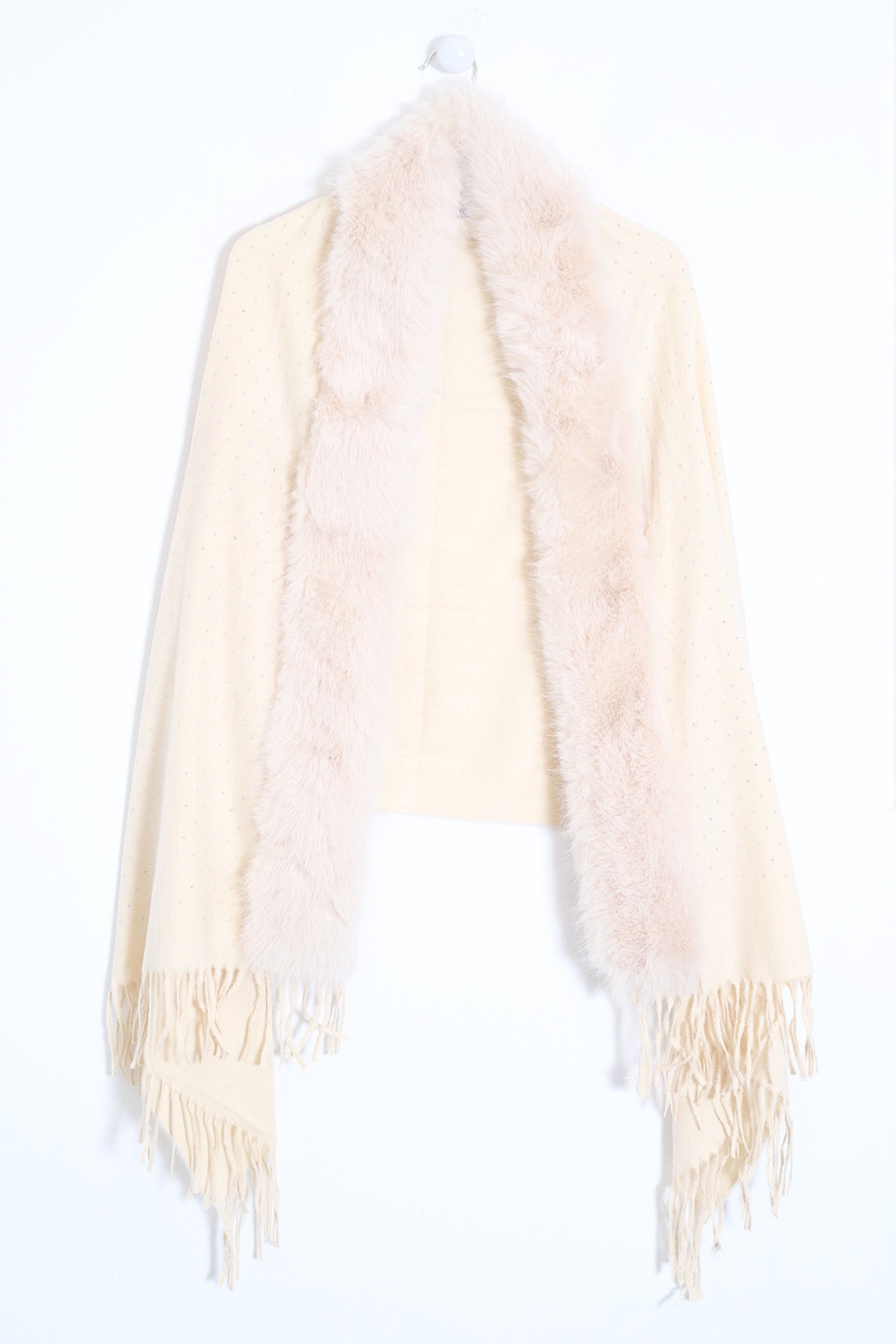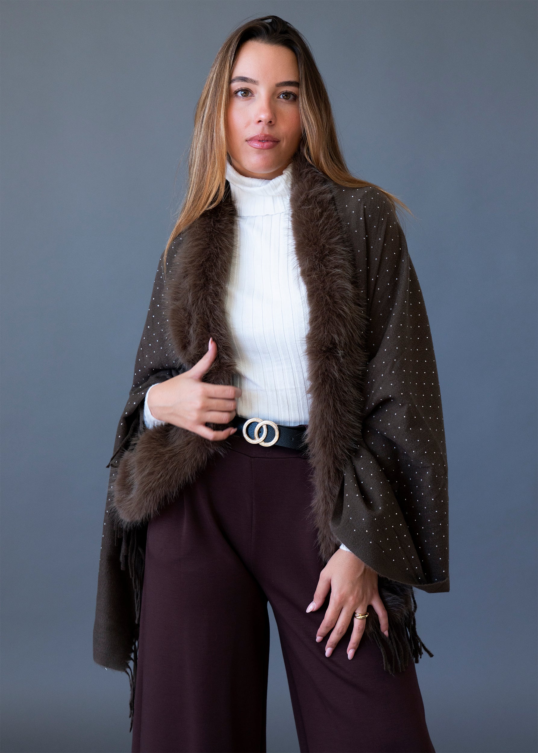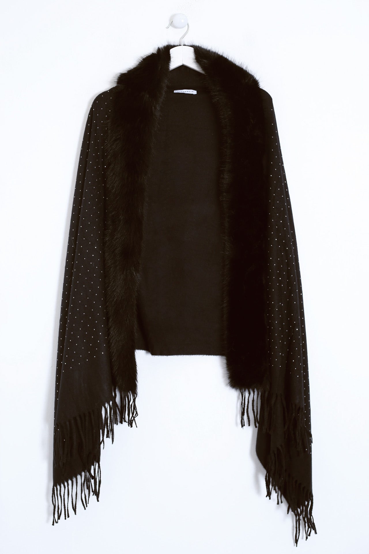 Chal con cuello solapa efecto pelo. Acabados con flecos. Tejido soft con aplicaciones de brillos.