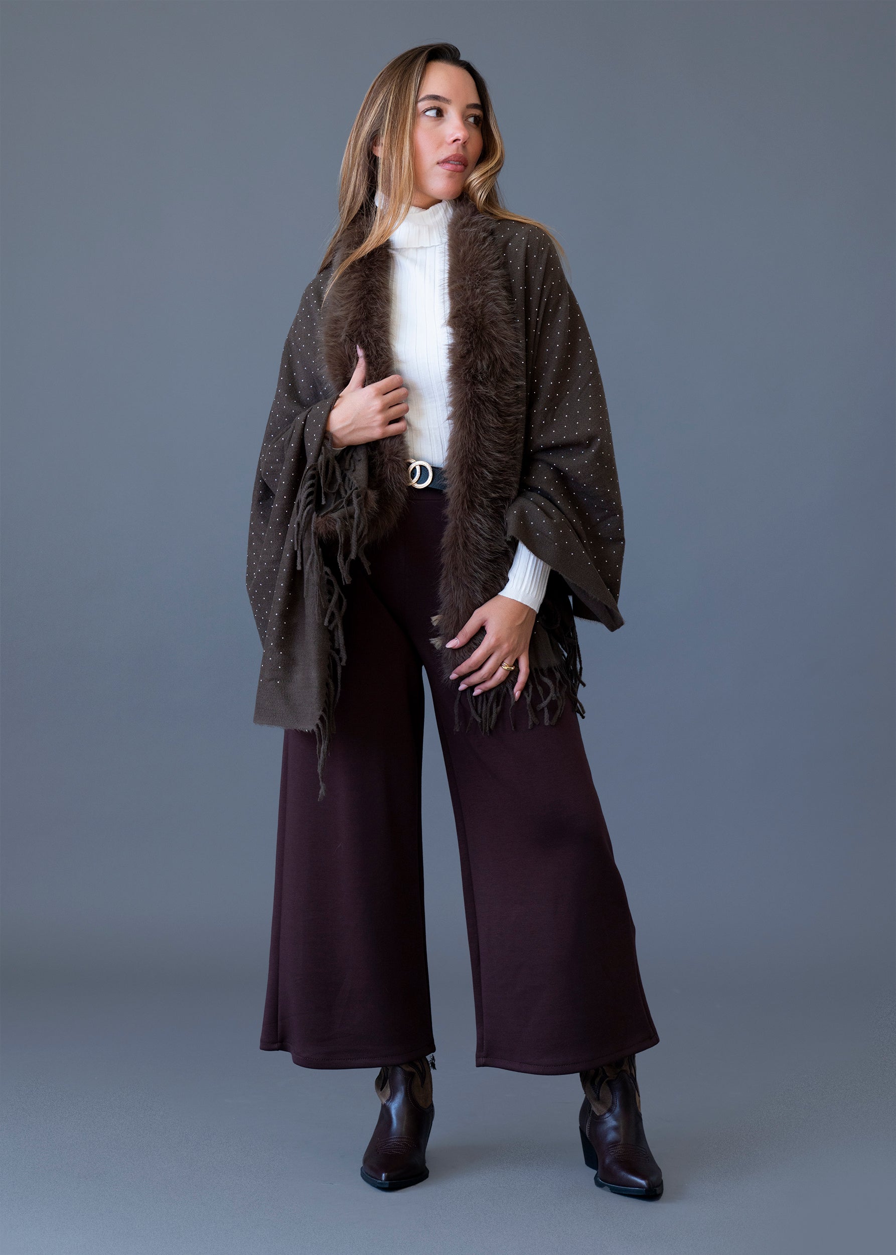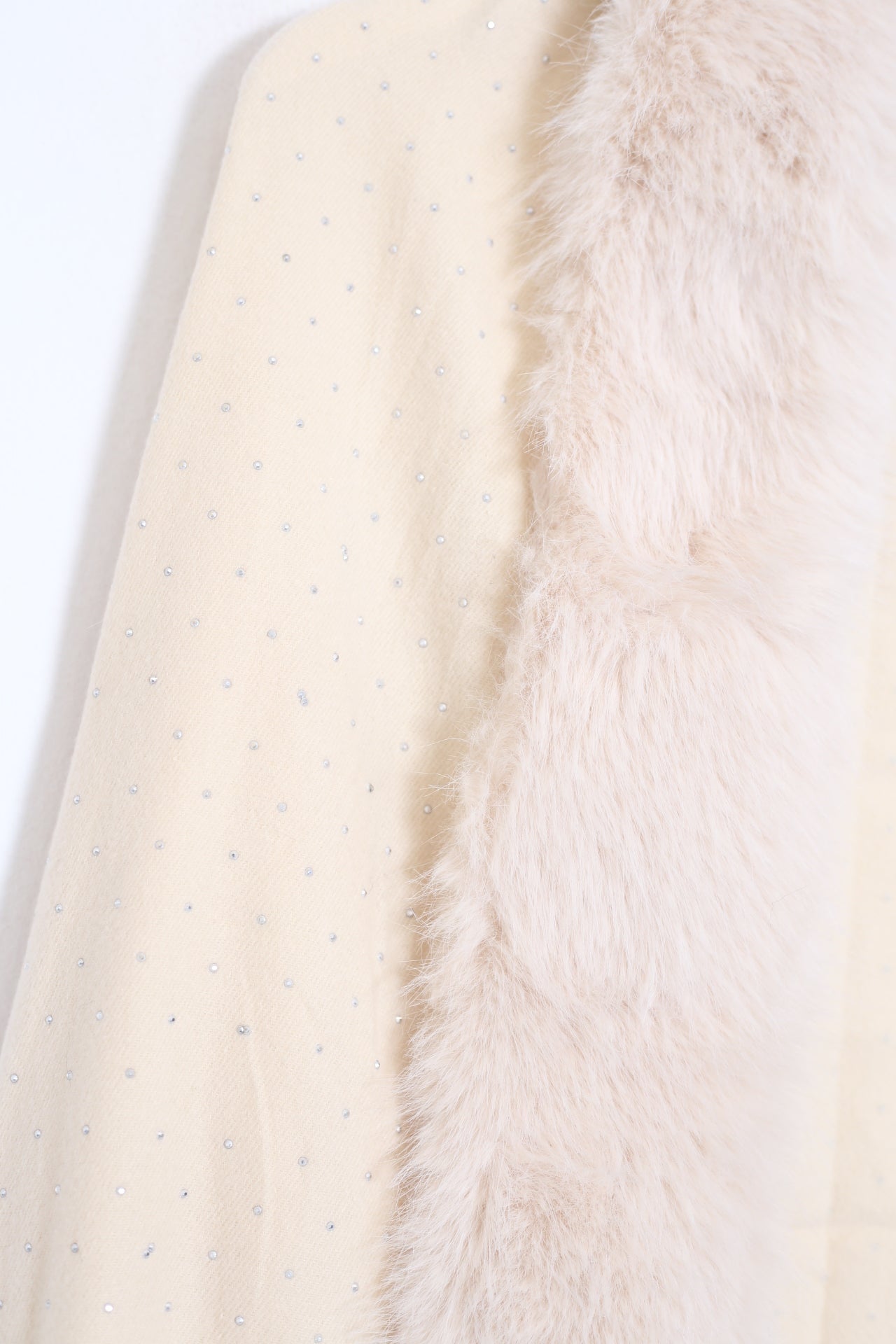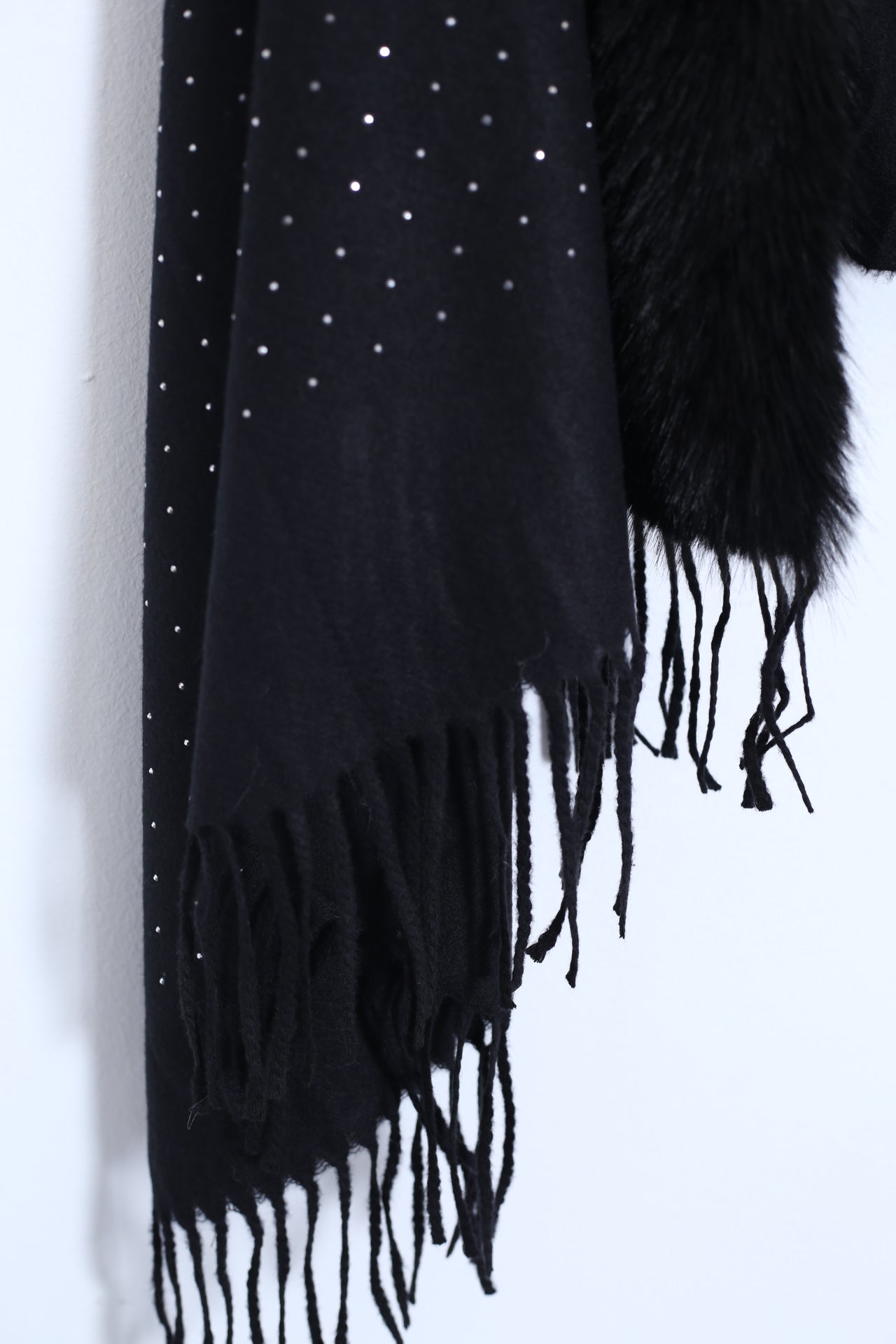 Chal con cuello solapa efecto pelo. Acabados con flecos. Tejido soft con aplicaciones de brillos.