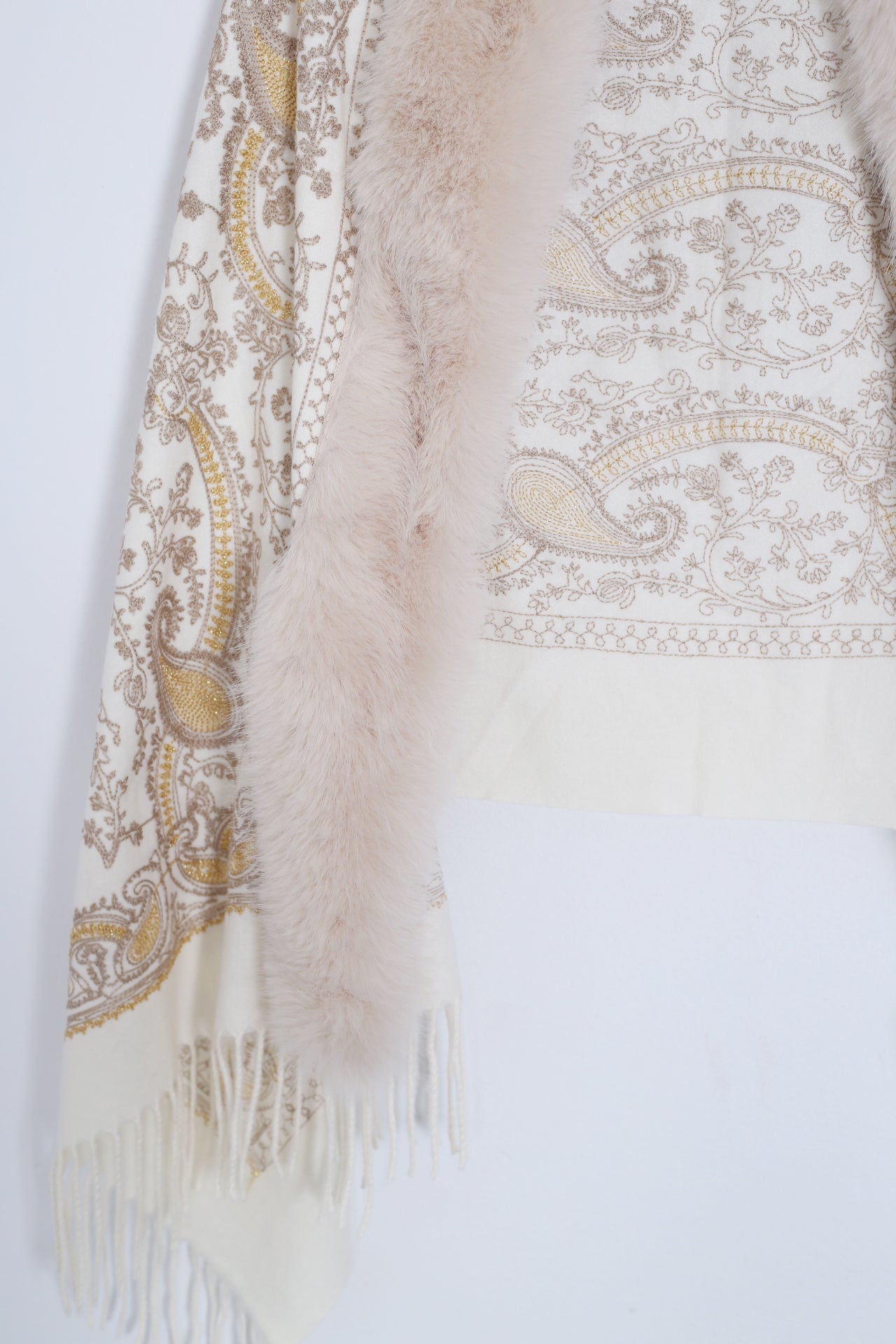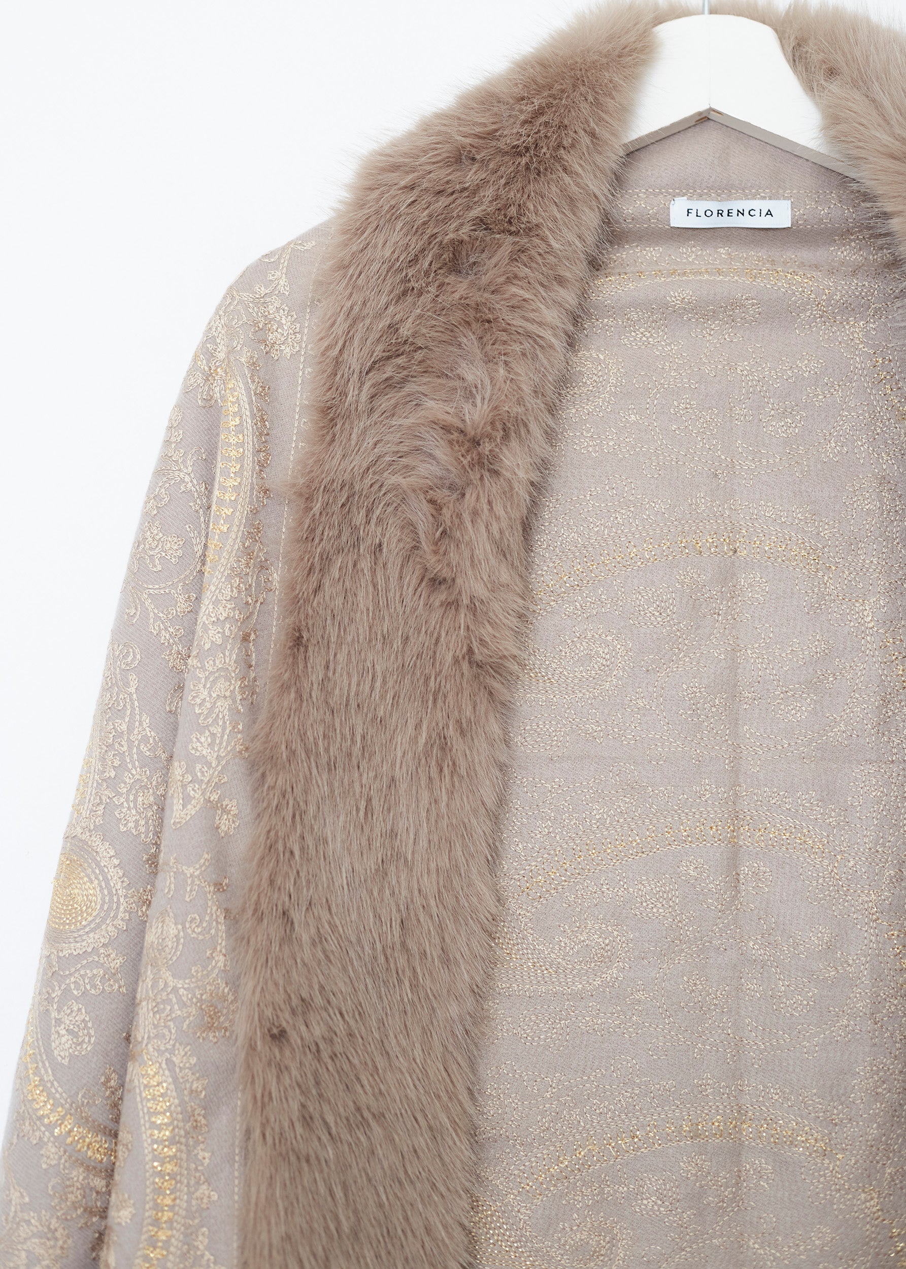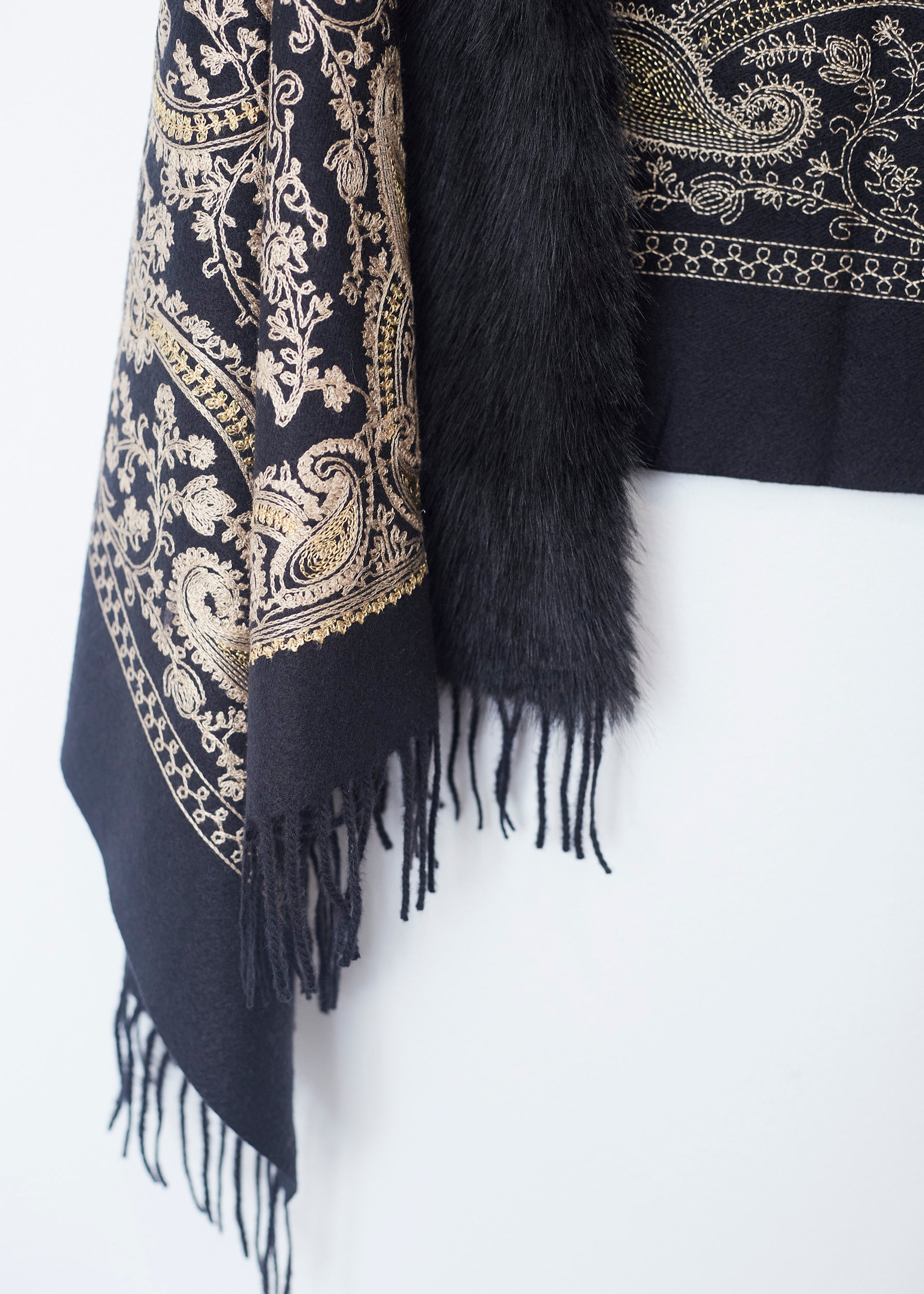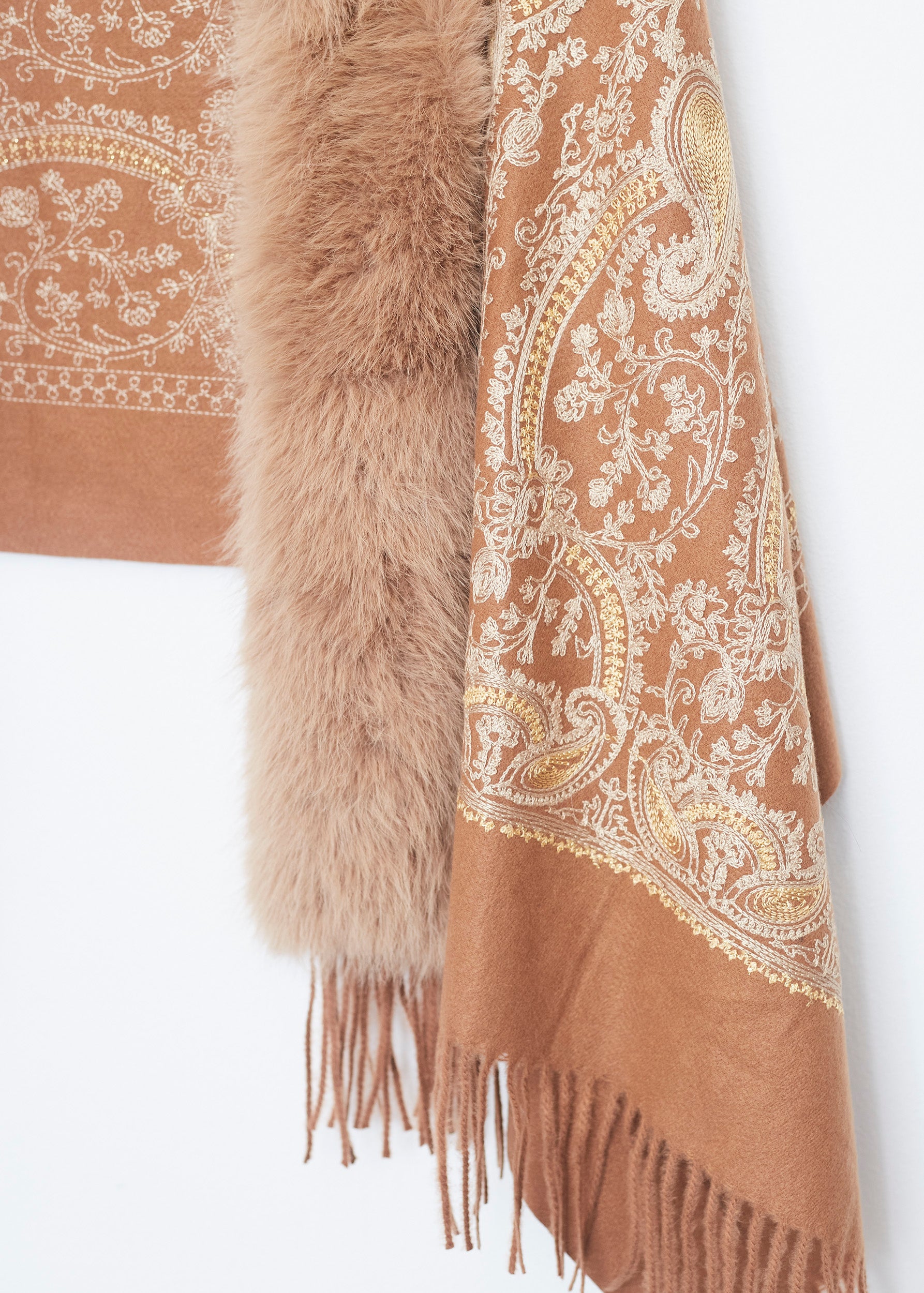 Chal de cuello acabado en efecto pelo. Bajos acabados en flecos. Detalle de bordados florales.