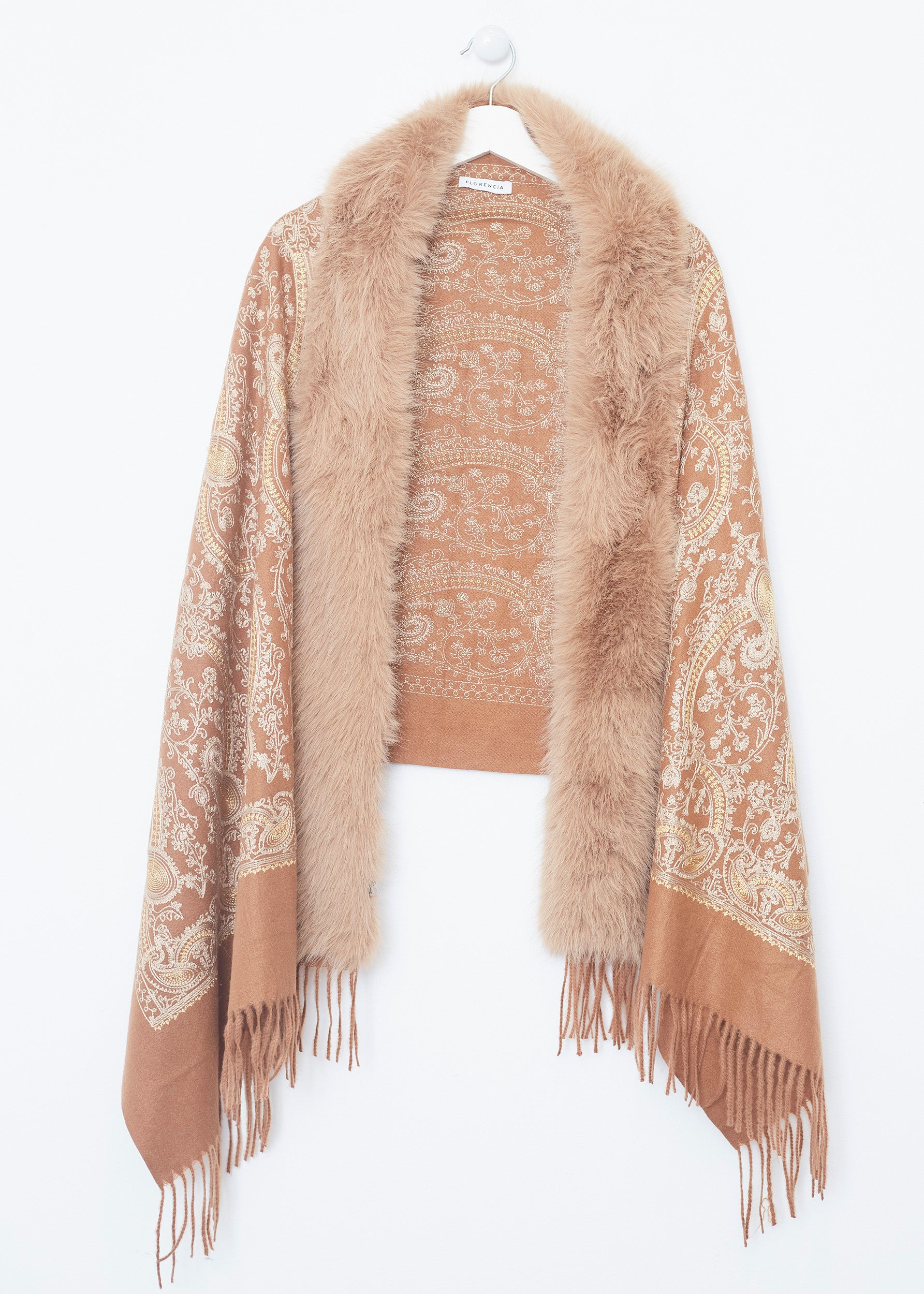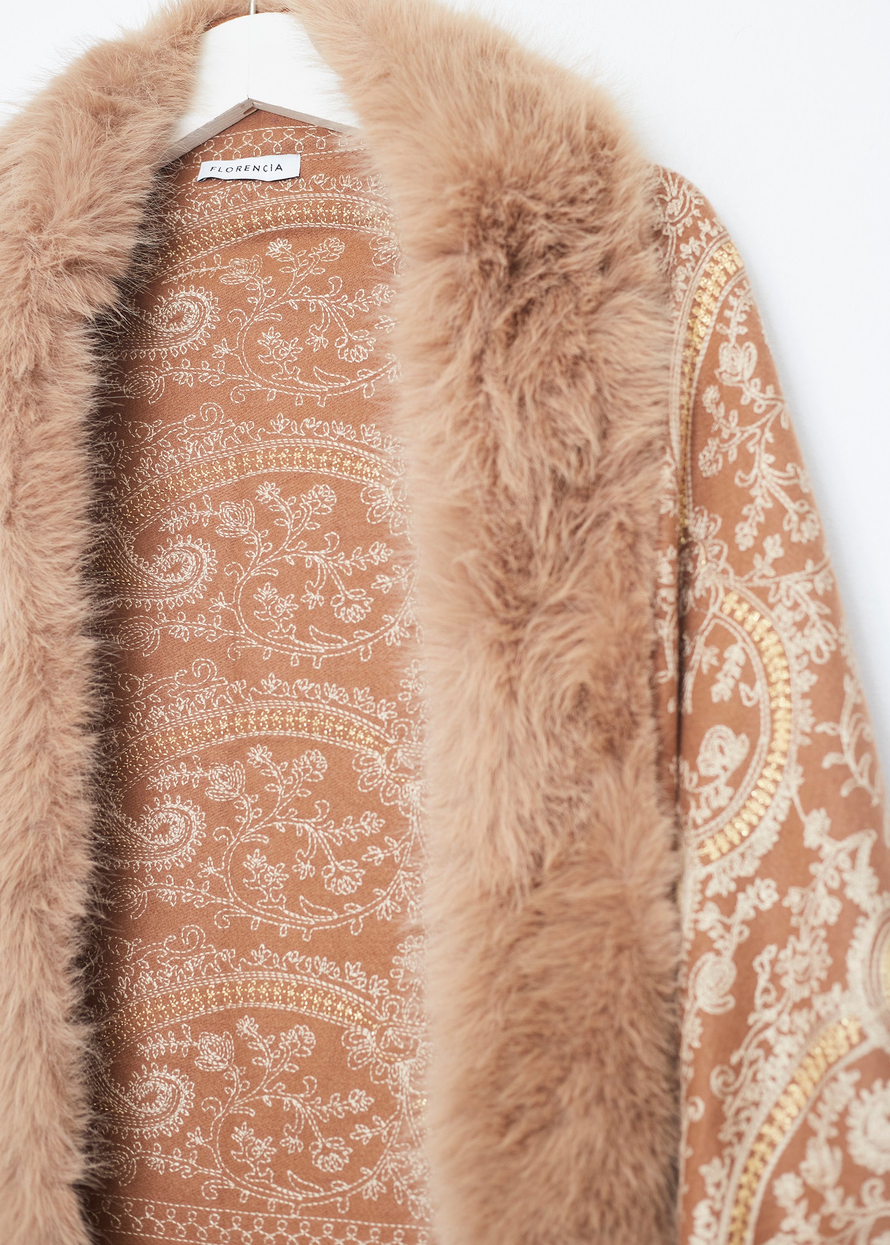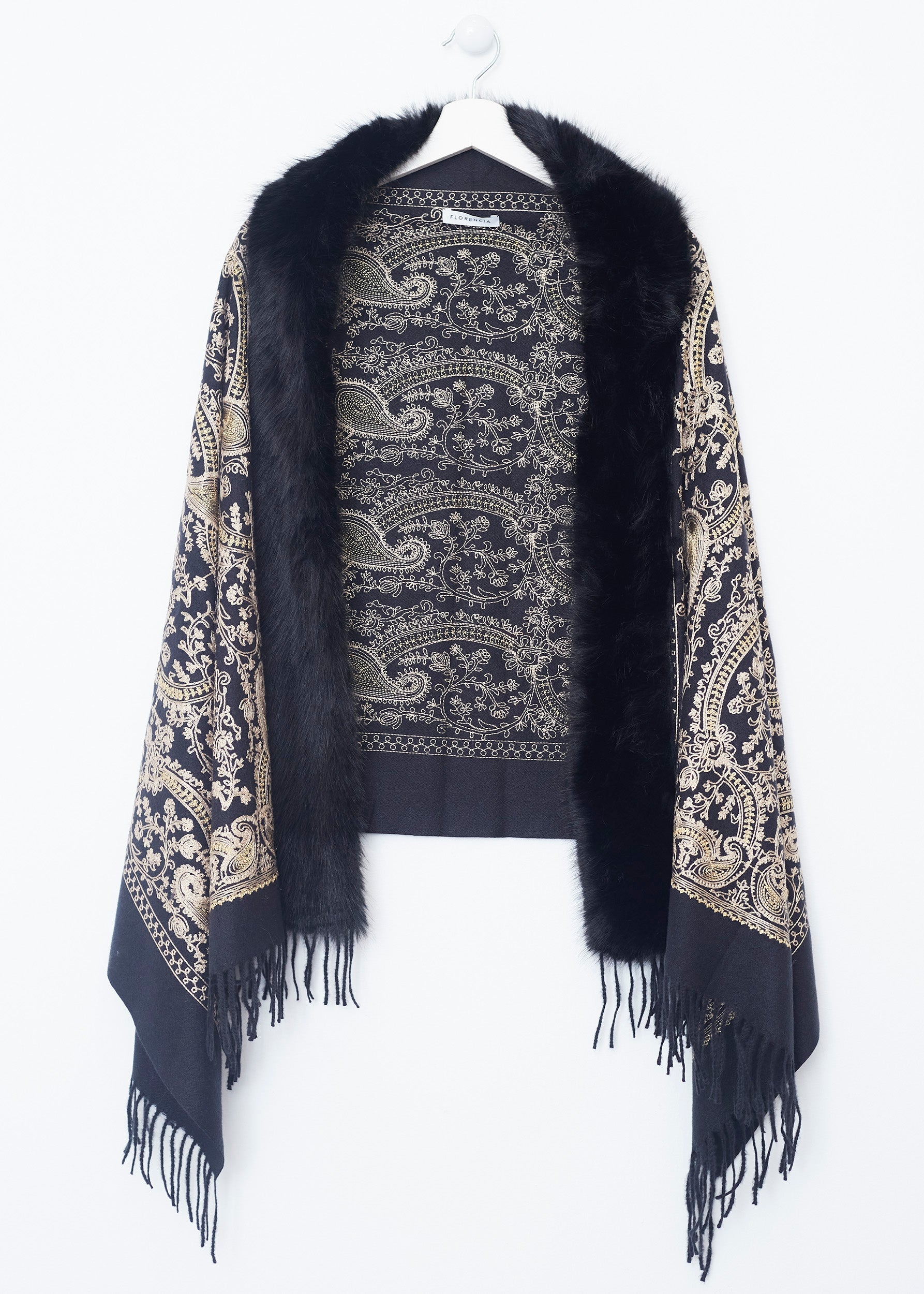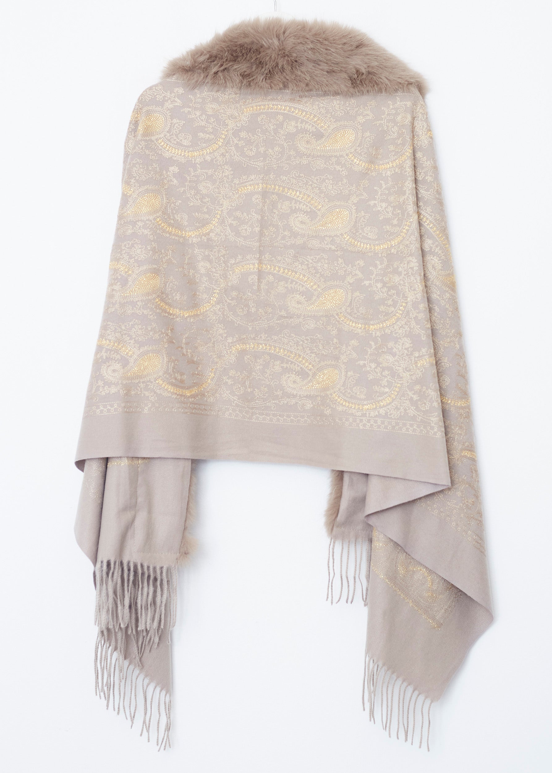 Chal de cuello acabado en efecto pelo. Bajos acabados en flecos. Detalle de bordados florales.