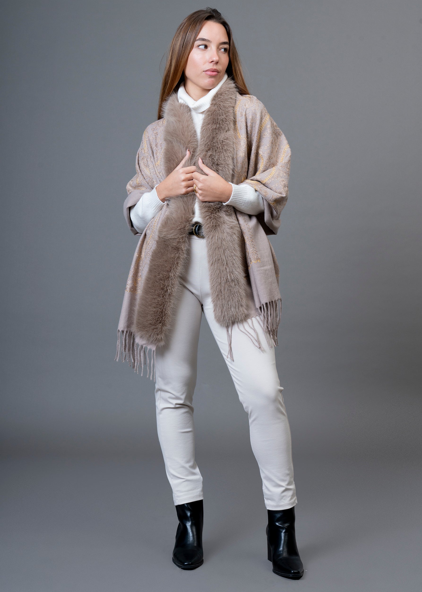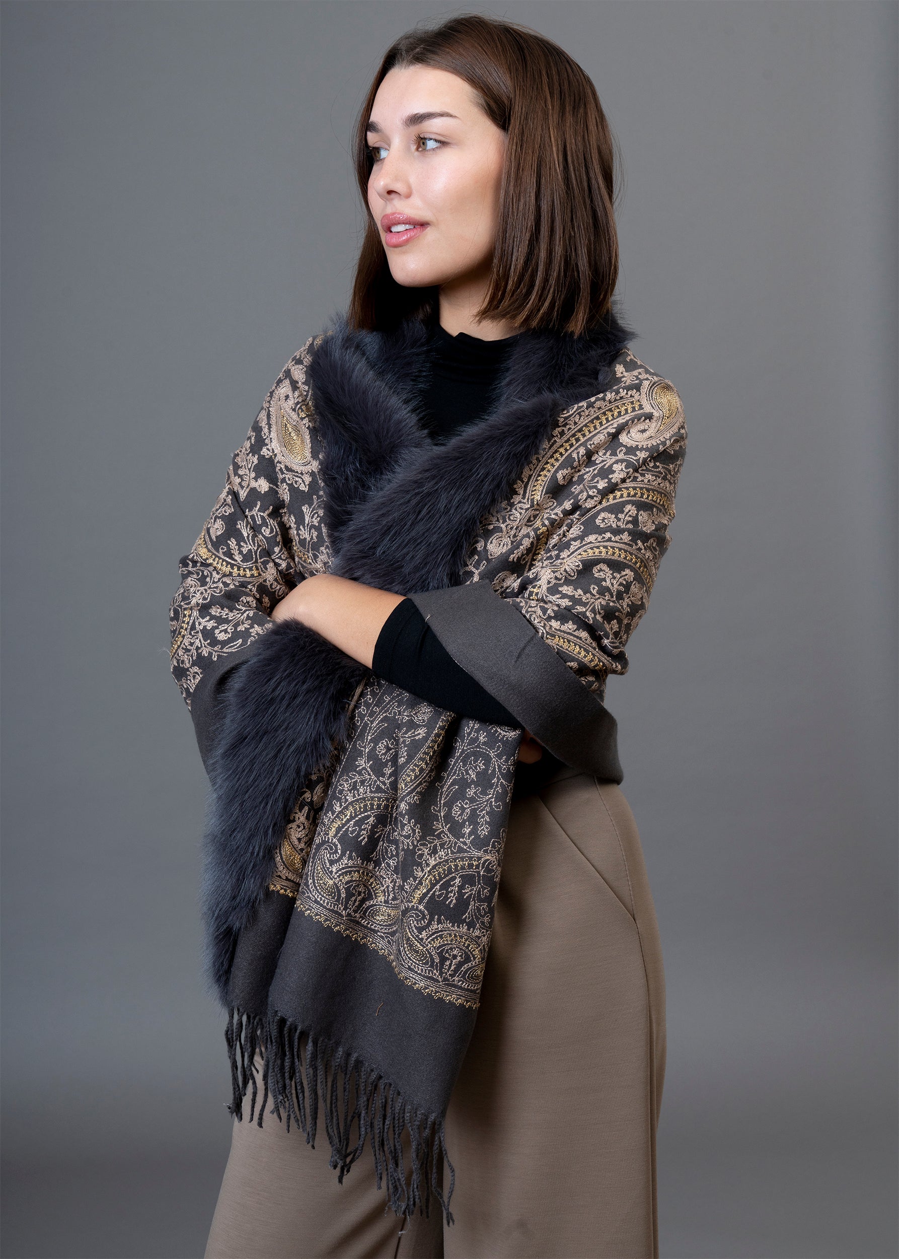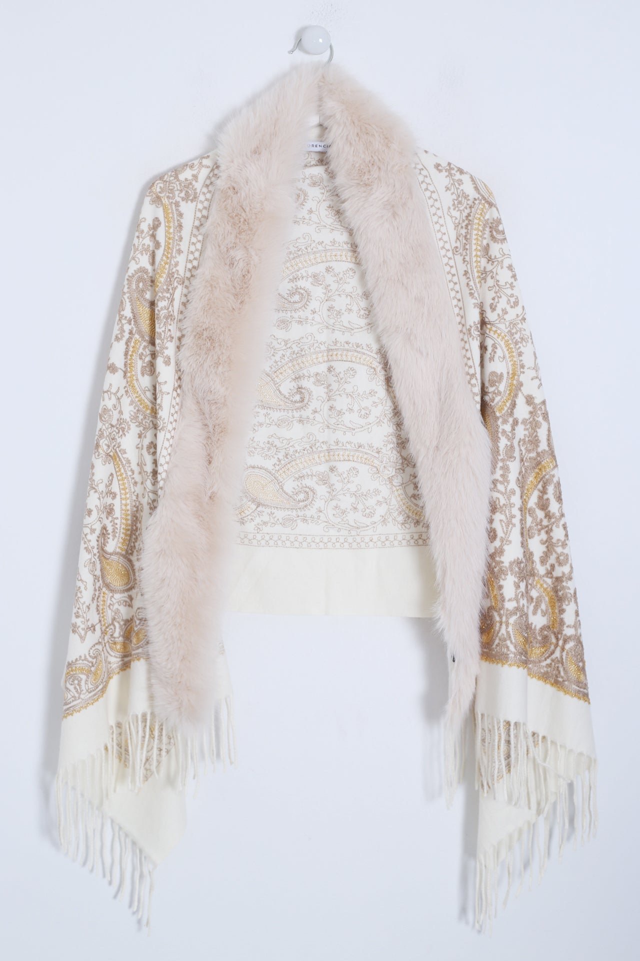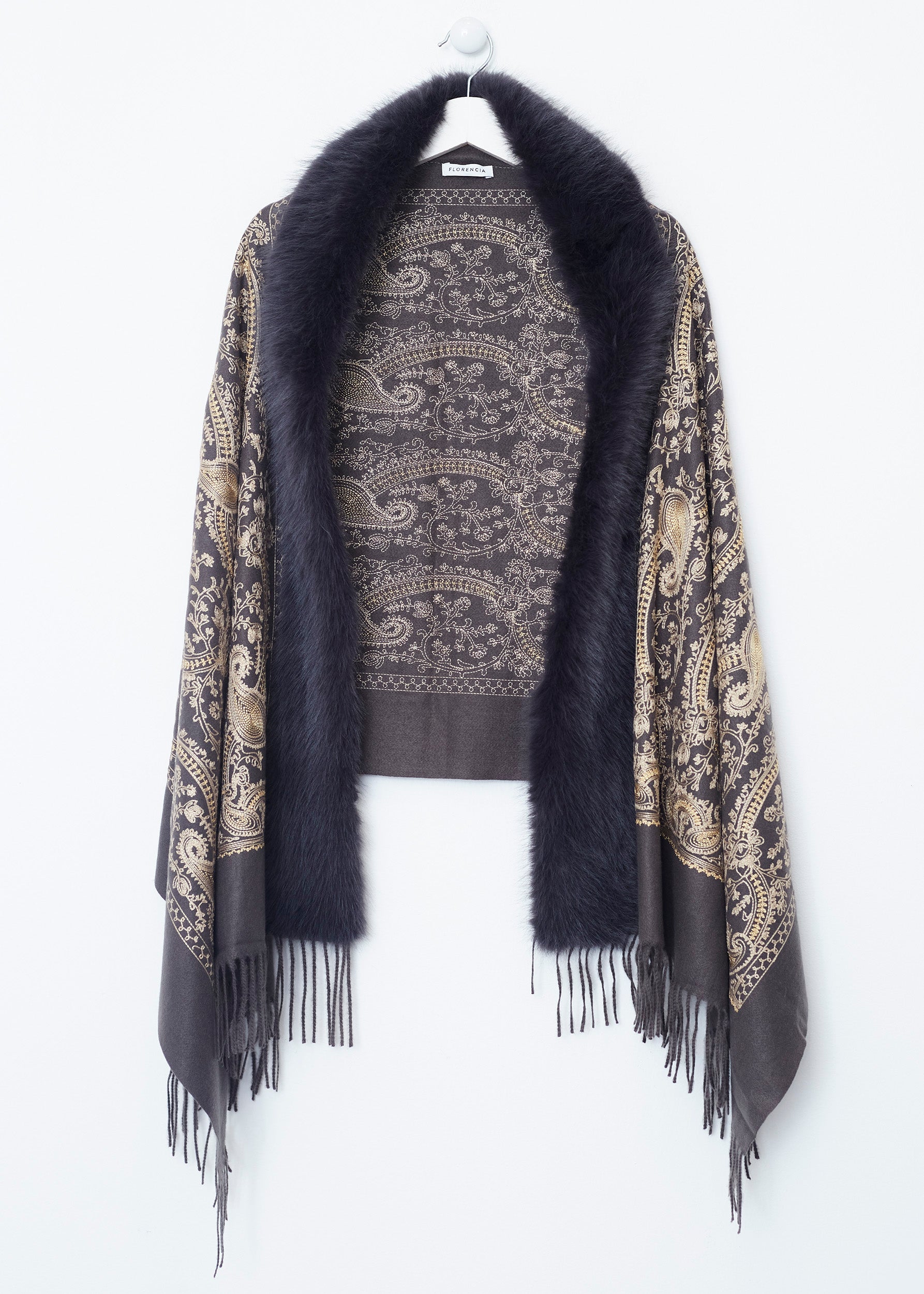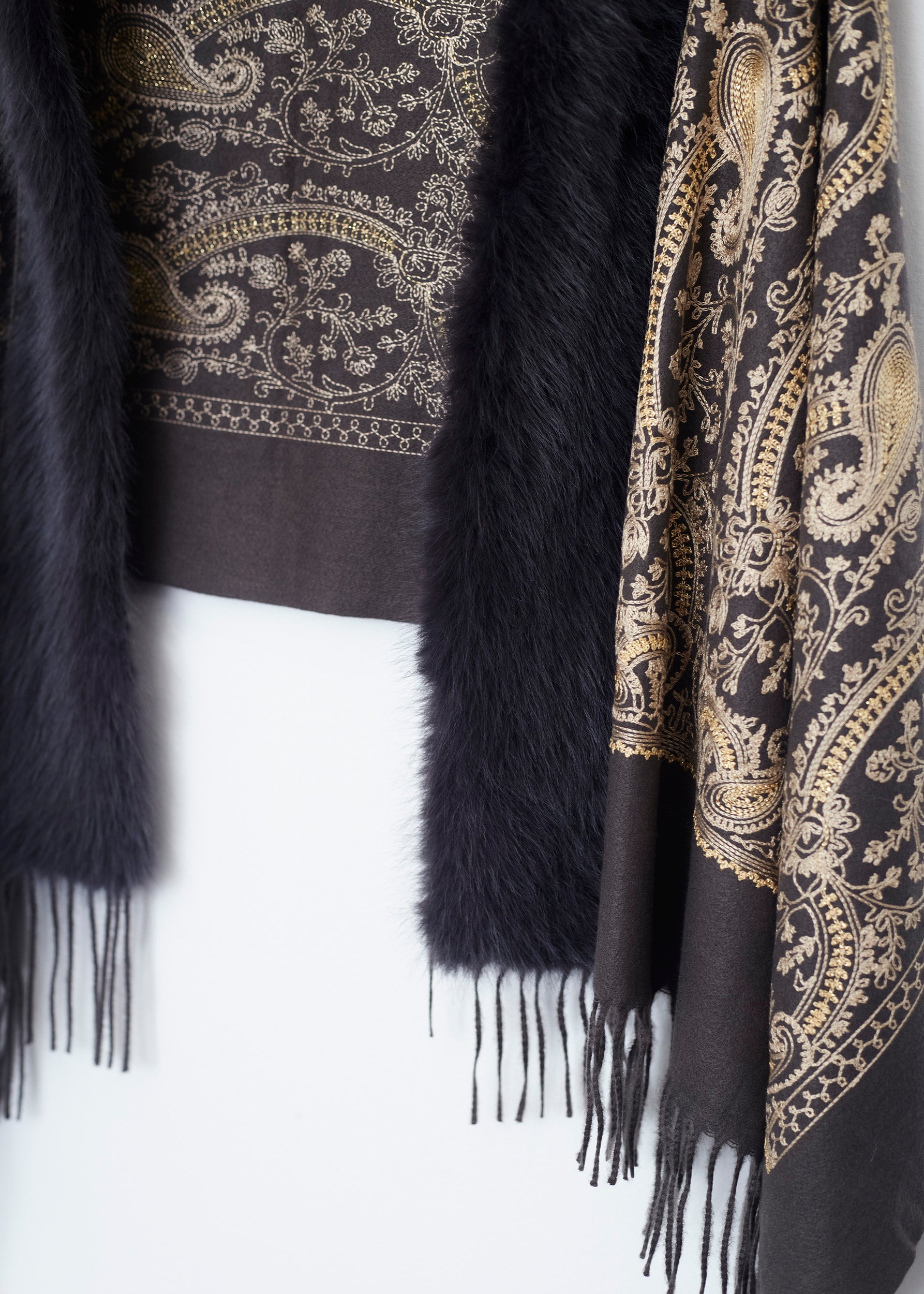 Chal de cuello acabado en efecto pelo. Bajos acabados en flecos. Detalle de bordados florales.