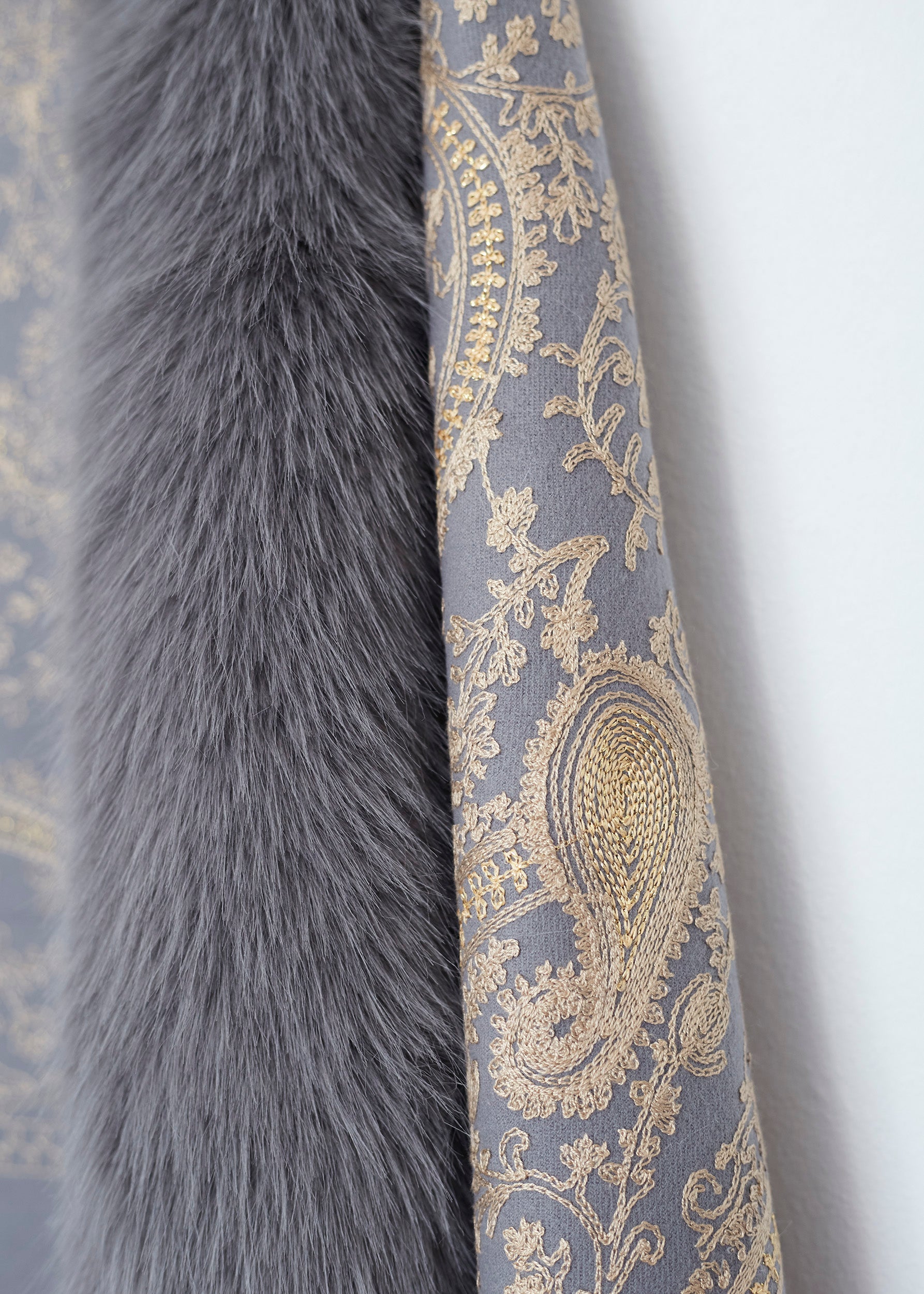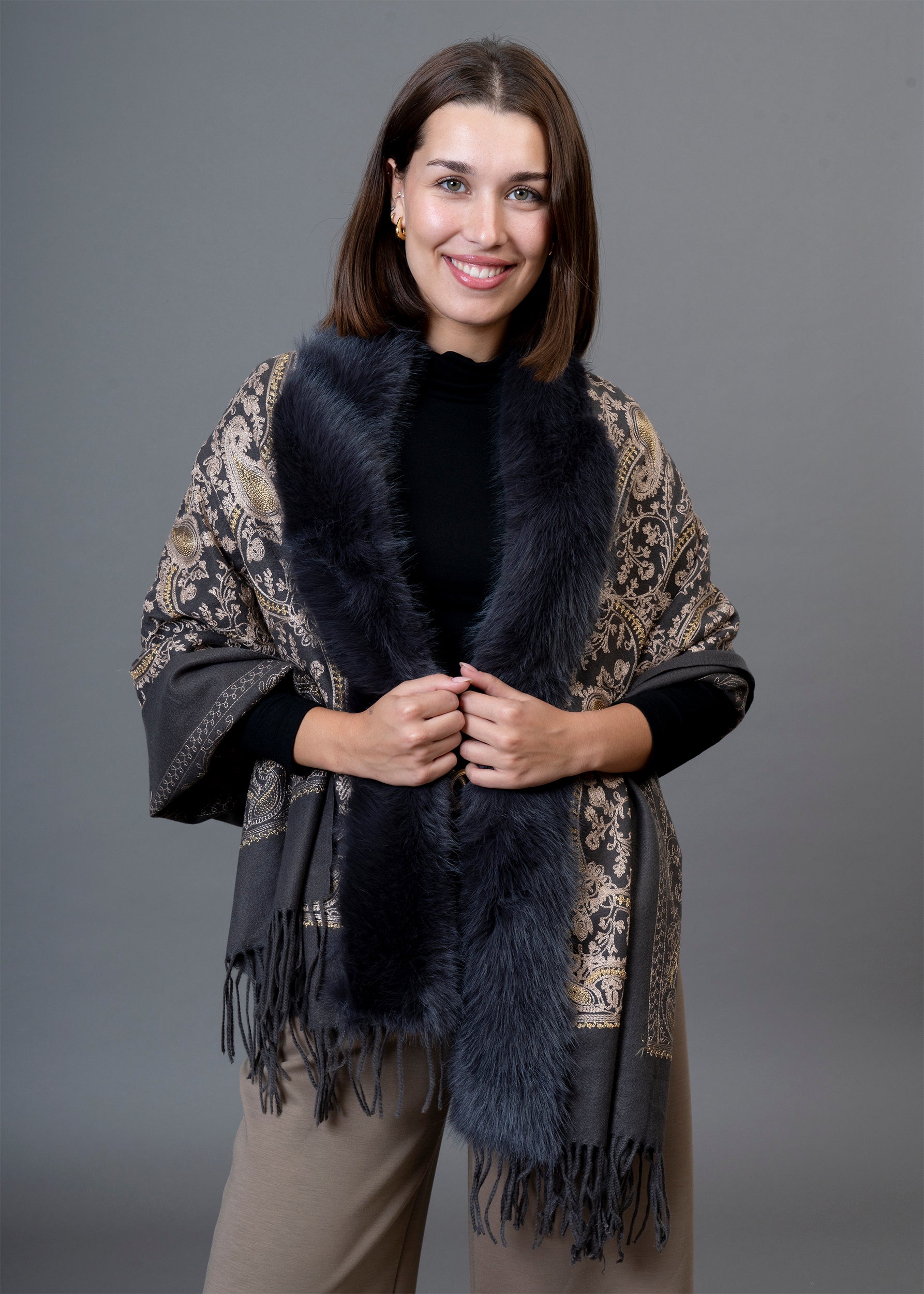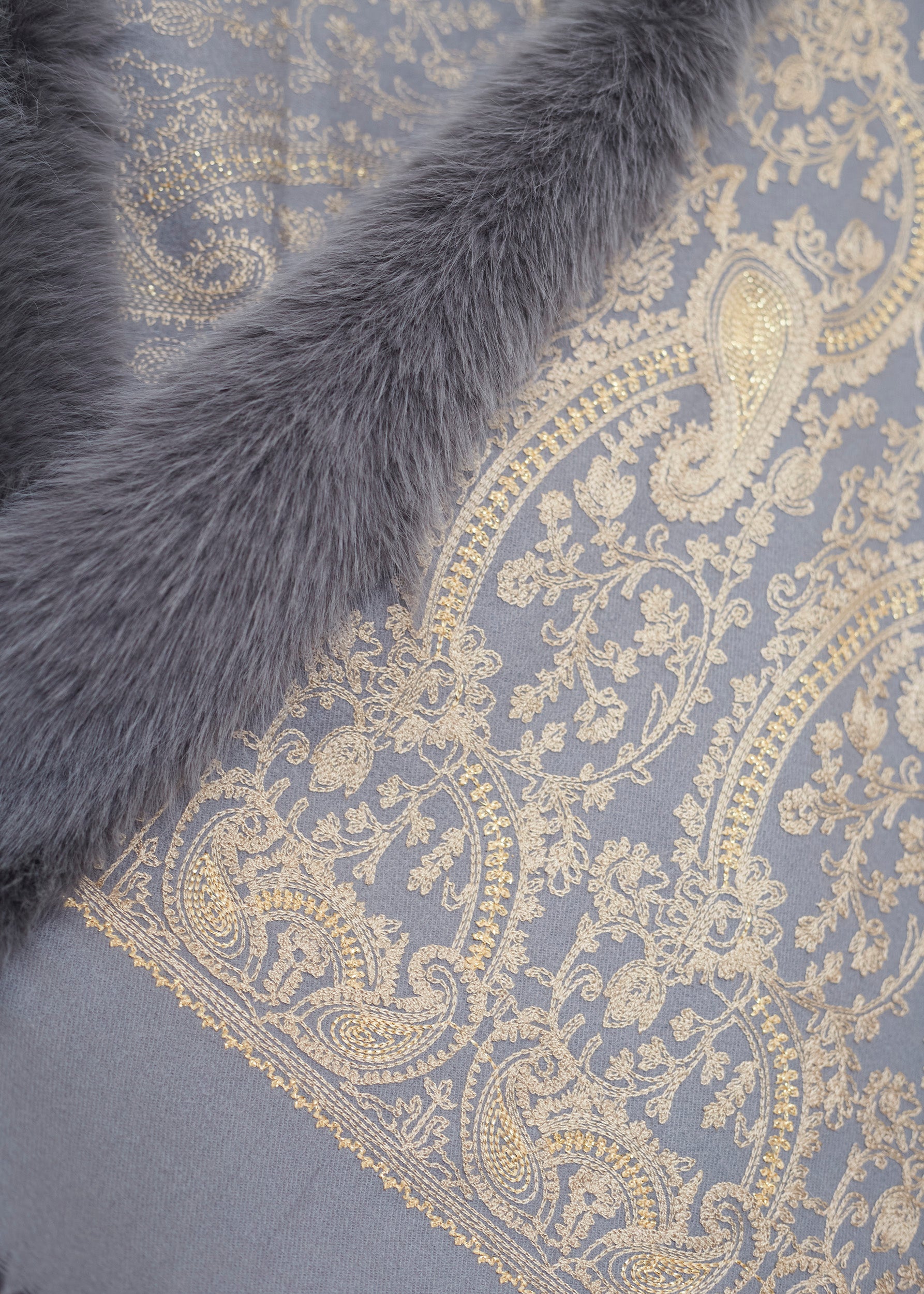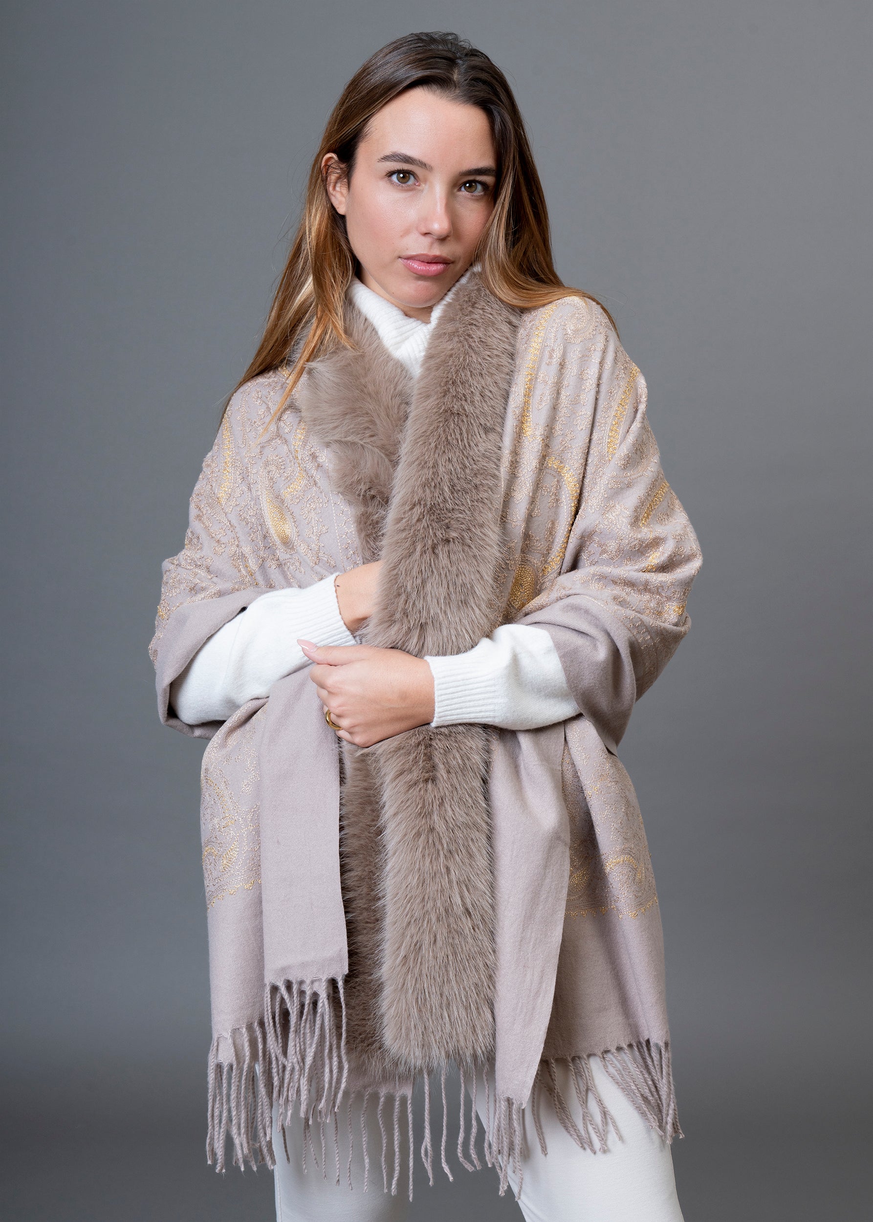 Chal de cuello acabado en efecto pelo. Bajos acabados en flecos. Detalle de bordados florales.